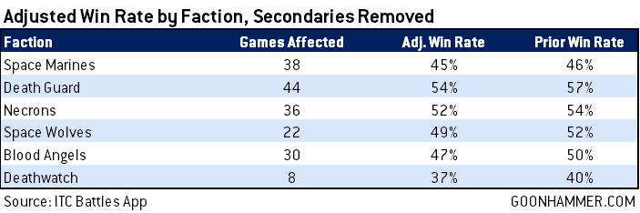 This is a tough question to answer, and one we're still working on and waiting on more data for. We can do some quick back-of-the-napkin math on this to arrive at an approximate figure in the meantime, however. The short version is that there were 4,478 games in our sample where one or both players picked a faction secondary and of those 506 had a margin of victory of 3 points or fewer, indicating that they'd likely have been impacted by forcing a player with a faction secondary. Of those, 139 featured both players using faction secondaries, leaving us with 367 games whose outcomes could have flipped as a result of losing 1-3 victory points from secondary objectives. This leaves us with the following chart, showing a 2-3% point drop in win rates across each faction, with Space Wolves and Blood Angels taking the hardest hits. Death Guard also look bad but recall that this quick calculation is less likely to be accurate for them as their average secondary scores are significantly lower, and so it's more likely that a more rigorous analysis would see them losing fewer games as a result of losing faction secondary points. Likewise, effects will be slightly greater still on Space Wolves and Blood Angels, the two factions most likely to double up on faction secondaries with Oaths of Moment.