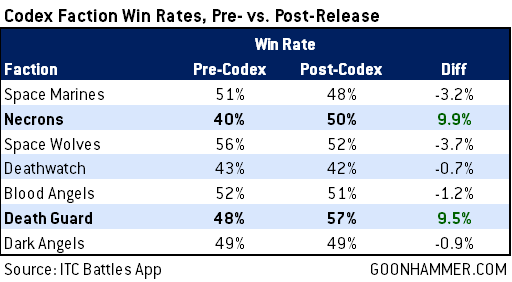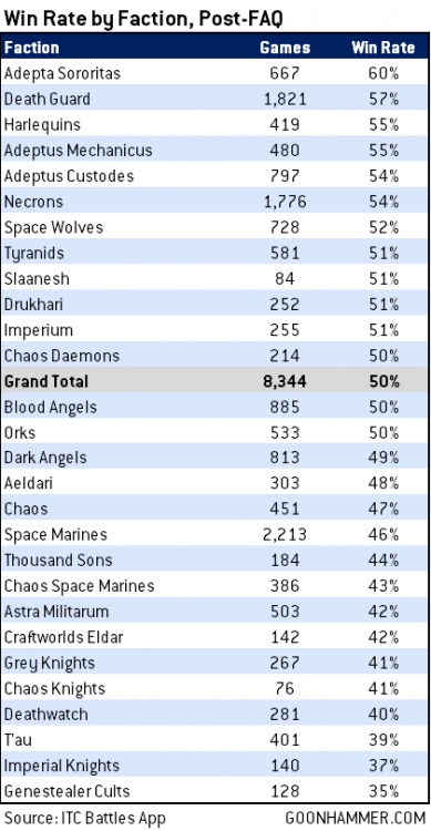With any new faction and ruleset that introduces powerful new rules to the game there’s always going to be accusations of broken-ness in the new rules. But as is often the case, those aren’t borne out by results. In this case however, we’ve seen a massive jump in effectiveness for Death Guard - to 57% win rates, and a slight/non-significant decrease for Dark Angels.