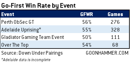 Even with some missing games that prevents us from doing by-round data for Adelaide, we have four events that feature what we might consider relatively sparse terrain and the tournament with the most dense layout - Perth - has the highest Go-First Win Rates, suggesting that terrain isn’t nearly as big a factor as people are making it out to be.