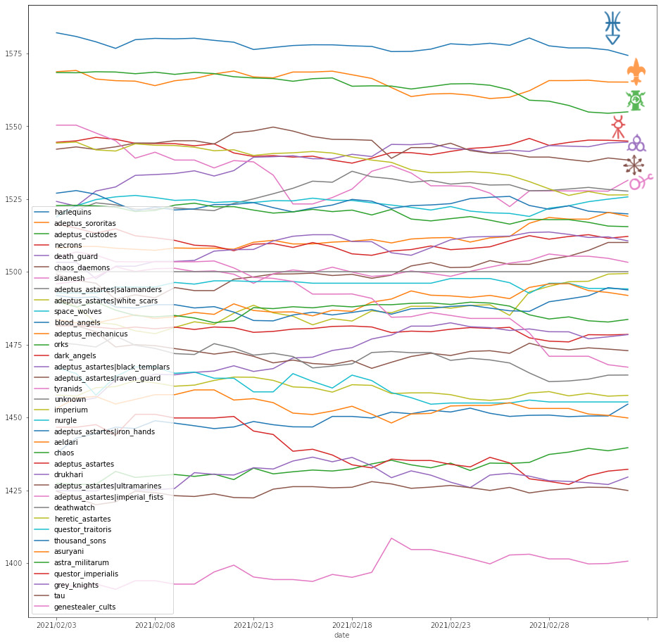 Glicko Scores over the last 30 days show a similar trend, with rapid growth from Death Guard as Sororitas and stay close behind. Some of the big losers over the last 30 days? White Scars, who dropped significantly thanks to a 50% overall win rate, and Imperial Fists, who just plummeted over the course of the month thanks to an absolutely abysmal 34% win rate. Which seems odd, given that vehicle targets may be more plentiful than ever but keep in mind it's also much harder to actually max Bring it Down even with more vehicles on the table. Please press "F" in the comments below to pay your respects to Jack "BenBooley" Hunter. It should also be noted that if the headline 46% win rate for Marines "feels" low to you, weaker chapters pulling it down is probably a contributor.