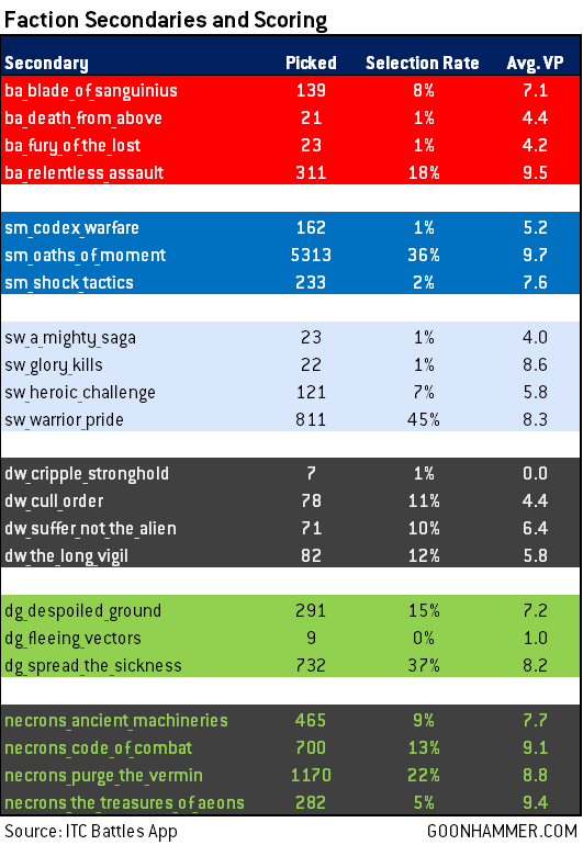 Let's take a quick look at the current faction secondaries that we have enough data for. With an overall post-FAQ average of 7.4 points for non-mission secondary objectives (and a standard deviation of around 4), anything that averages 7.5 or higher for a faction is likely to be a decent secondary choice to build around or attempt, and anything worth more than 9 points on average can be considered exceptional, as post-FAQ none of the non-missions secondaries hit that mark (Bring it Down and Abhor the Witch used to). That means that