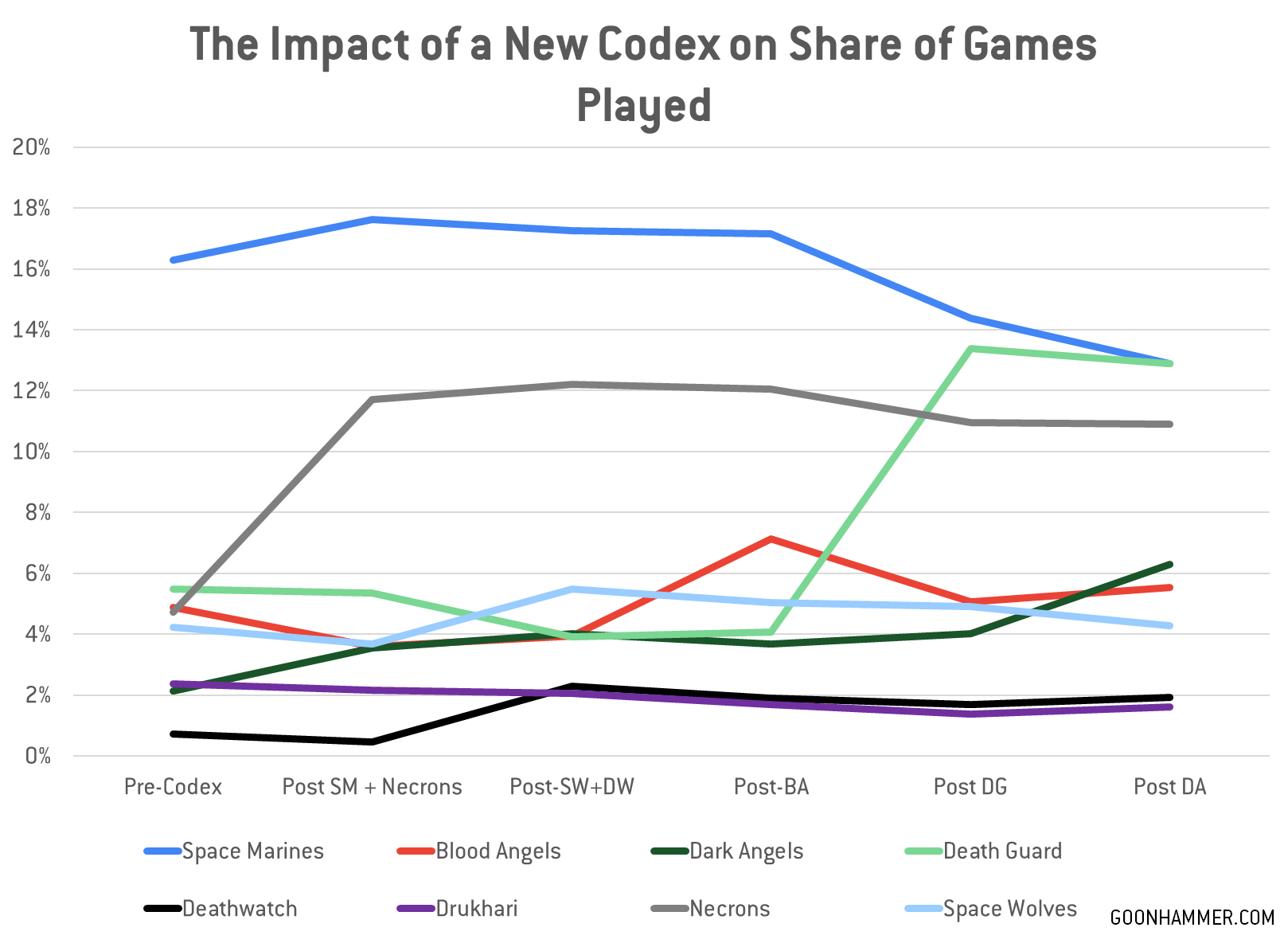 With the exception of main book Space Marines, the share of games played for armies tends to double following the release of a new codex, though Necrons more than tripled their pre-Codex share of games played - this was in part because of players dropping “Nurgle” as a faction in favor of monofaction Death Guard. Currently Drukhari sit at just below 2% of games played - expect that number to jump to around 5% following their Codex.
