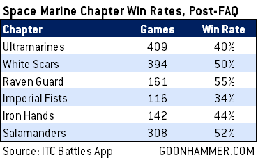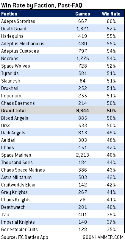 While Necrons have held pat, Space Marines have been struggling a bit, posting a 46% overall win rate since the new FAQ dropped, though there was little to affect them directly in it.