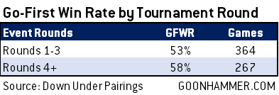 All of the data we’ve collected since the FAQ from GT-sized events with 5 or more rounds suggests that, yes, going first is an even bigger advantage in later rounds, where record matching is likely to pair players of similar skill levels against each other. Go-first win rates for games played in rounds 4+ are 58%, significantly higher than games played in rounds 1-3, and massively higher than round 1, where the player going first won only 48% of their games, albeit over a sample of only 125 games. This then increases to around 60% in the final rounds.