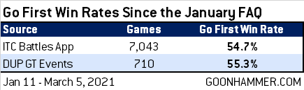 Something I covered in our recent Hammer of Math on missions in the 2020 GT missions pack was that missions seem to have a clear impact on go-first win rates that is primarily in-line with the benefits we’ve seen for missions as a whole. Unfortunately, this is an area where we don’t have enough data from BCP/DUP to do the same analysis for tournament games post-FAQ - there just haven’t been enough large events reporting that data.