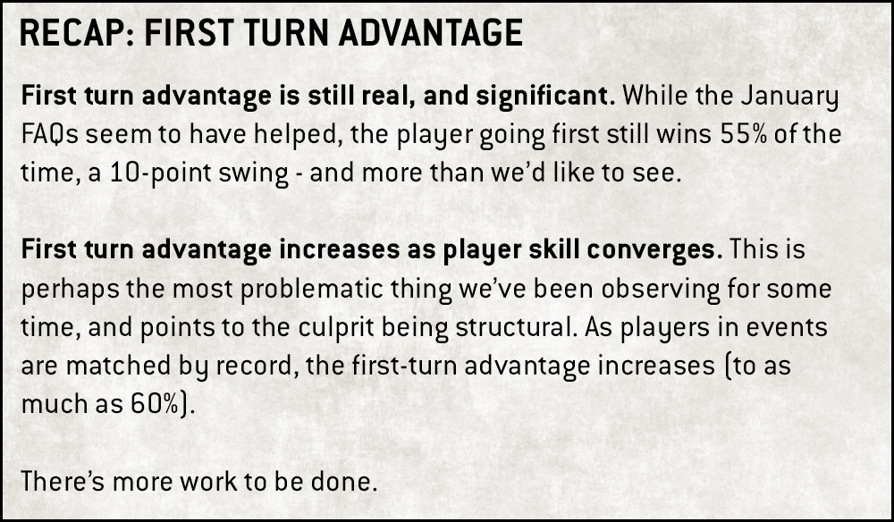 This new rate - about 55% - is a small but statistically significant decrease from the pre-FAQ number, but not so much from our initial post-FAQ analysis, where we saw something between 55 and 56% win rates for the player going first. It’s an improvement, but not enough to change the fact that there’s a 10-point swing in win rates between going first and going second.