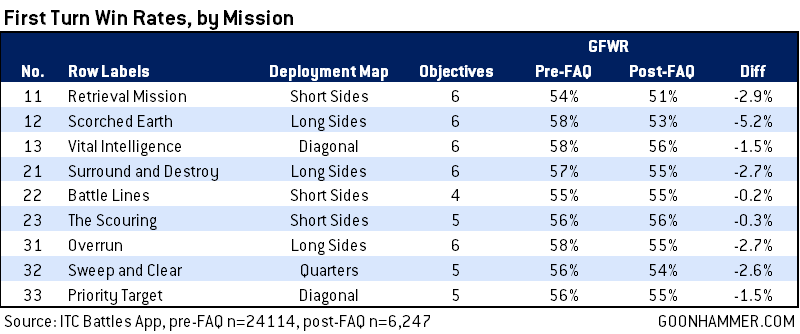 Something else we pointed out last time - that still seems to be the case - is that deployment map is also likely a factor. This was true before the FAQ changes, and appears to be less true after, though this is in part because of the large drop in go-first win rates for games played on the Scorched Earth mission. It’s worth continuing to look at these results in the future, particularly as we get more tournament game data post-FAQ.
