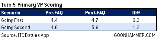 - Changing primary scoring so that primary scoring for the player going second occurs at the end of their fifth turn instead of during the Command phase.