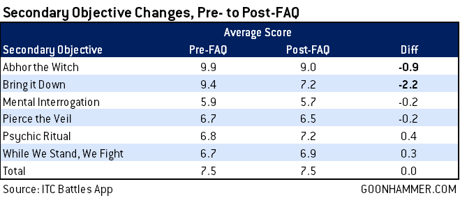 So when it comes to these secondaries, the January FAQ had a large impact. Less so on Abhor the Witch - though scoring for that secondary dropped by nearly a point on average - and more so for Bring it Down, where average scores dropped by more than 2 points. Scoring for the other psychic secondaries and While We Stand, We Fight did not seem to be significantly impact.