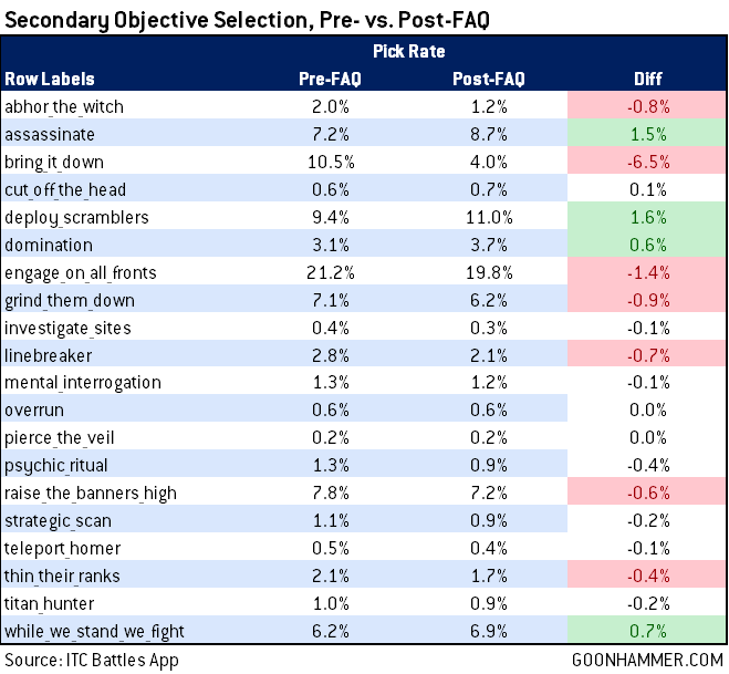 Not included here is the net impact on the win rates for factions that lack secondary objectives, which will only be positive as a result of these factions surrendering their "easy" points and losing 2-3% more of their games as a result.