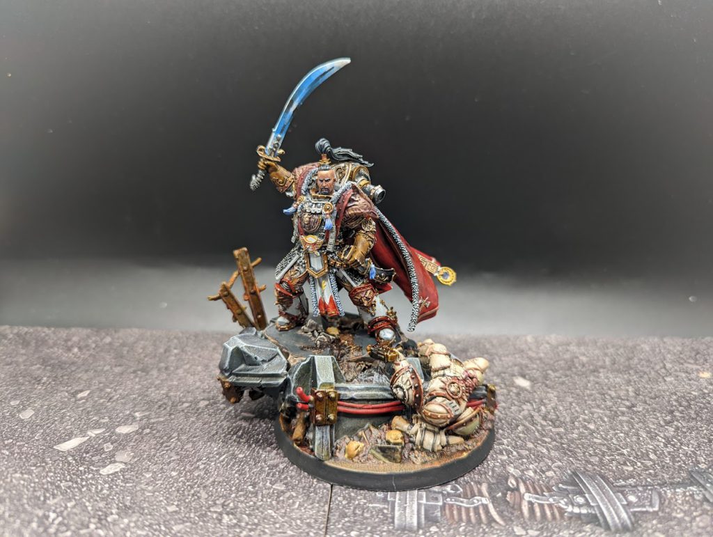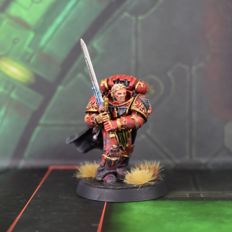 Going with the BA makes me a sucker in this series because a full third of us are doing the same, and I will be the third-best painter of three in every round-up. Whatever. These are my guys and I am thrilled to be diving in and getting them painted up. Despite most of the paint here being pretty GW-style Basic, I am trying to push myself a bit, chiefly with the use of weathering; I normally hate to get my pristine little guys dirty, but it does add a lot to them to be battered and bruised, and it's fun to add all the dust and dirt and scratches (and also helps to cover any mistakes, like my none-too-clean edge highlighting). I had a go at a better-than-usual face on the Praetor, too: