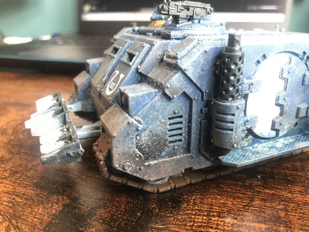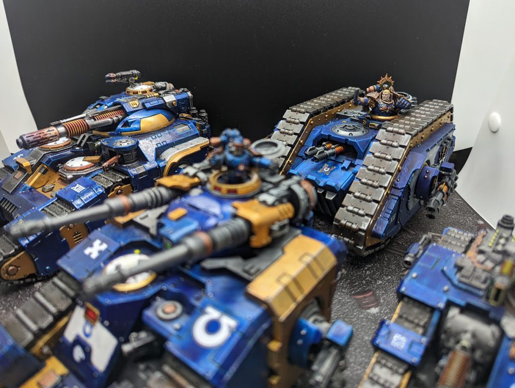 It's probably not quite as good as what I could achieve if I had an airbrush, but it came out more-or-less how I envisioned. I am exceedingly happy with the centerpiece of my Ultramarines Tank Army!