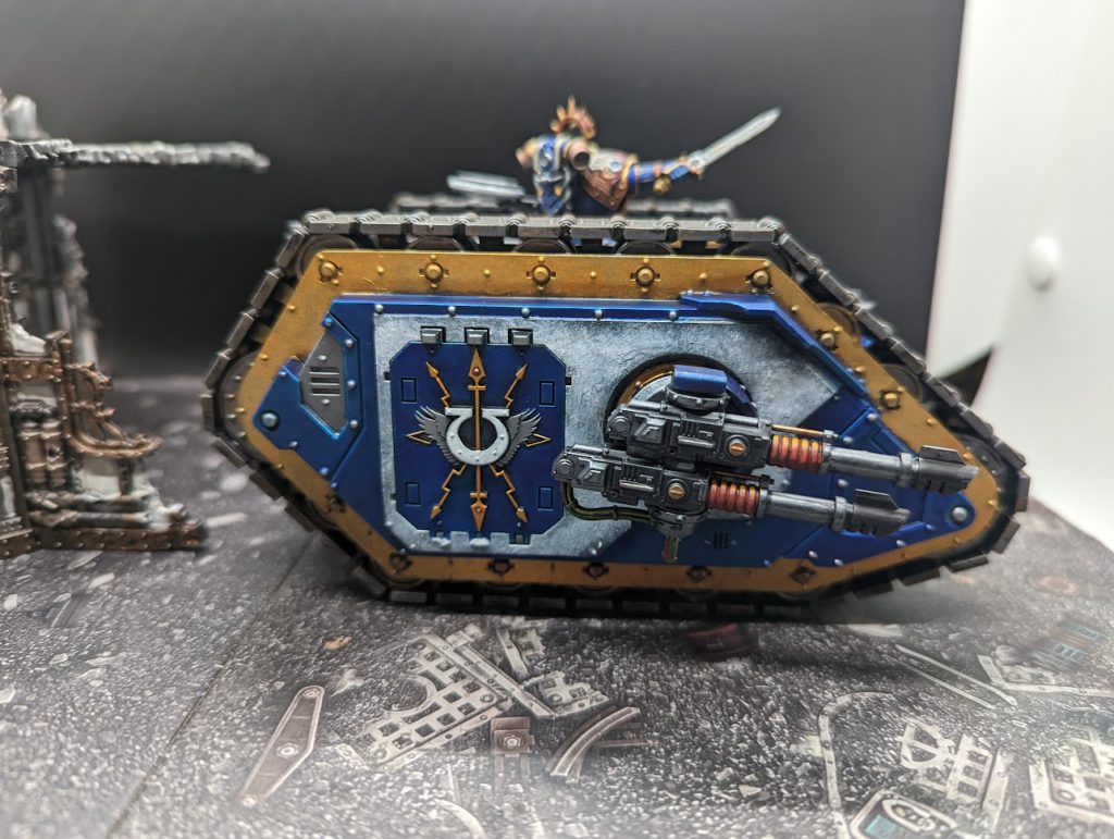 For the sides of the model, I wanted to try something new to break up the endless blue and gold that is kind of a pain to paint. The Liber Astartes book notes that Ultramarines vehicles have a marble finish for senior commanders on them, so I set about trying to give my take on the Flame of Illyrium a marble finish: