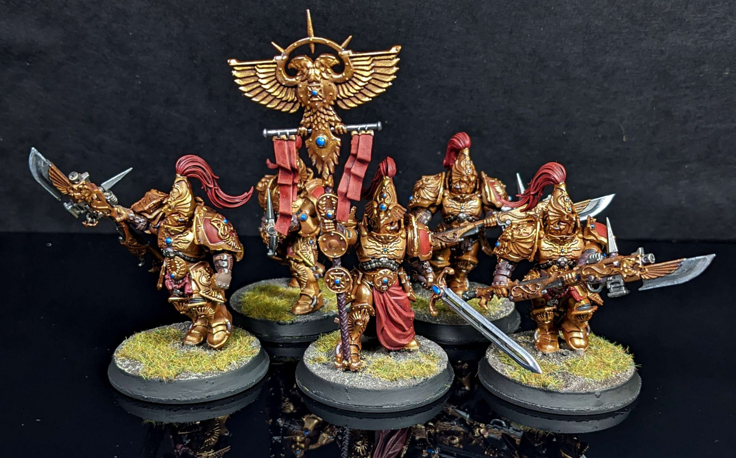 here). This inspired me to stick together some Custodes and Sisters of Silence that I've had lying around since around the time Burning of Prospero came out. I got hold of a few axes from the Warden kit for some of these Sentinel Guard. The painted ones were done many years ago but Retributor armour and reikland flesh shade still creates a decent effect. I might now redo these in my fancy vallejo gold if I can be bothered.