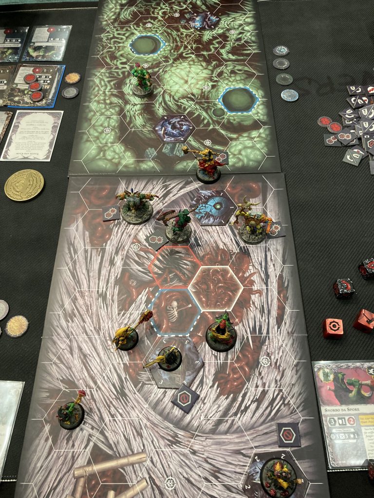 With two solid wins coming into the final round, I ended up at the top table against Tom, with Hedkrakka’s Madmob. The Madmob is an older Orc warband, but they still mix well with the Tooth and Claw deck. The combination of aggro from the warband with more aggro and chip damage from the deck, was perfectly tuned for my high-model-count, low-wound warband.
