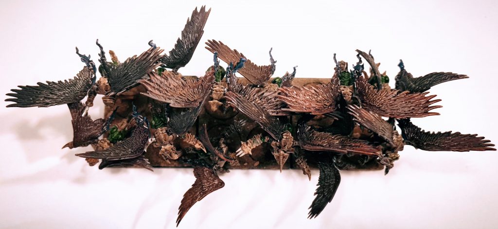 And the reason I love to paint them is the combination of their simplicity and subtlety. Feathers are desperate for drybrushing, and the fact that from a distance that's basically all you see of the Stryx makes a simple colour shift extremely effective. They seem to shimmer as they traverse the battlefield at great speed. They're perhaps the best return on investment I have in a model as far as painting effort is concerned.
