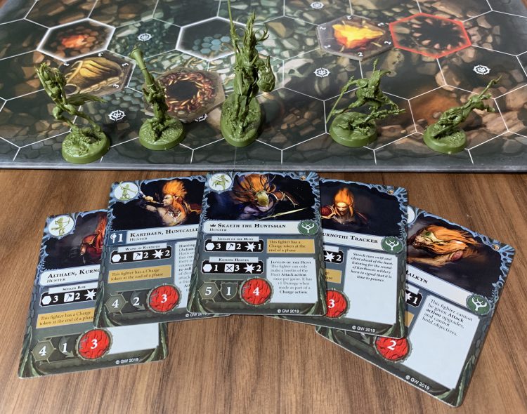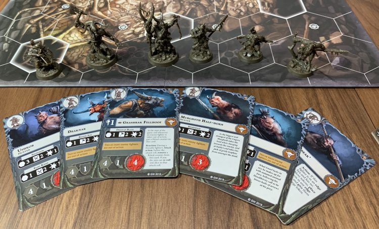 When using the pre-built decks that come in the box, Gashrak's Despoilers are an Objective Focused deck that wants to sneak about the board claiming territory before charging in to annihilate their enemies. Second-in-command Draknar features a punishing attack that can wipe out almost any fighter in the game with a single hit, especially when paired with all the new lethal hexes that will dot your game boards. Korsh 'the Sneak' has a... sneaky... ability that allows him to re-enter the board from any edge hex, setting up surprise attacks or objective grabs. Meanwhile, the lithe warriors of the Hunt will dart in and out of combat using hit-and-run tactics to harass enemies. A key ability unique to this warband is Karthaen's Hunting Horn; it takes an action to sound but offers the next attack by any friendly fighter re-rolls that may make the difference between victory and defeat. The lion-like malkyn Lighaen begins the battle as a harassing nuisance but can be upgraded into an absolute monster of a fighter capable of crossing an entire board to bring down foes.