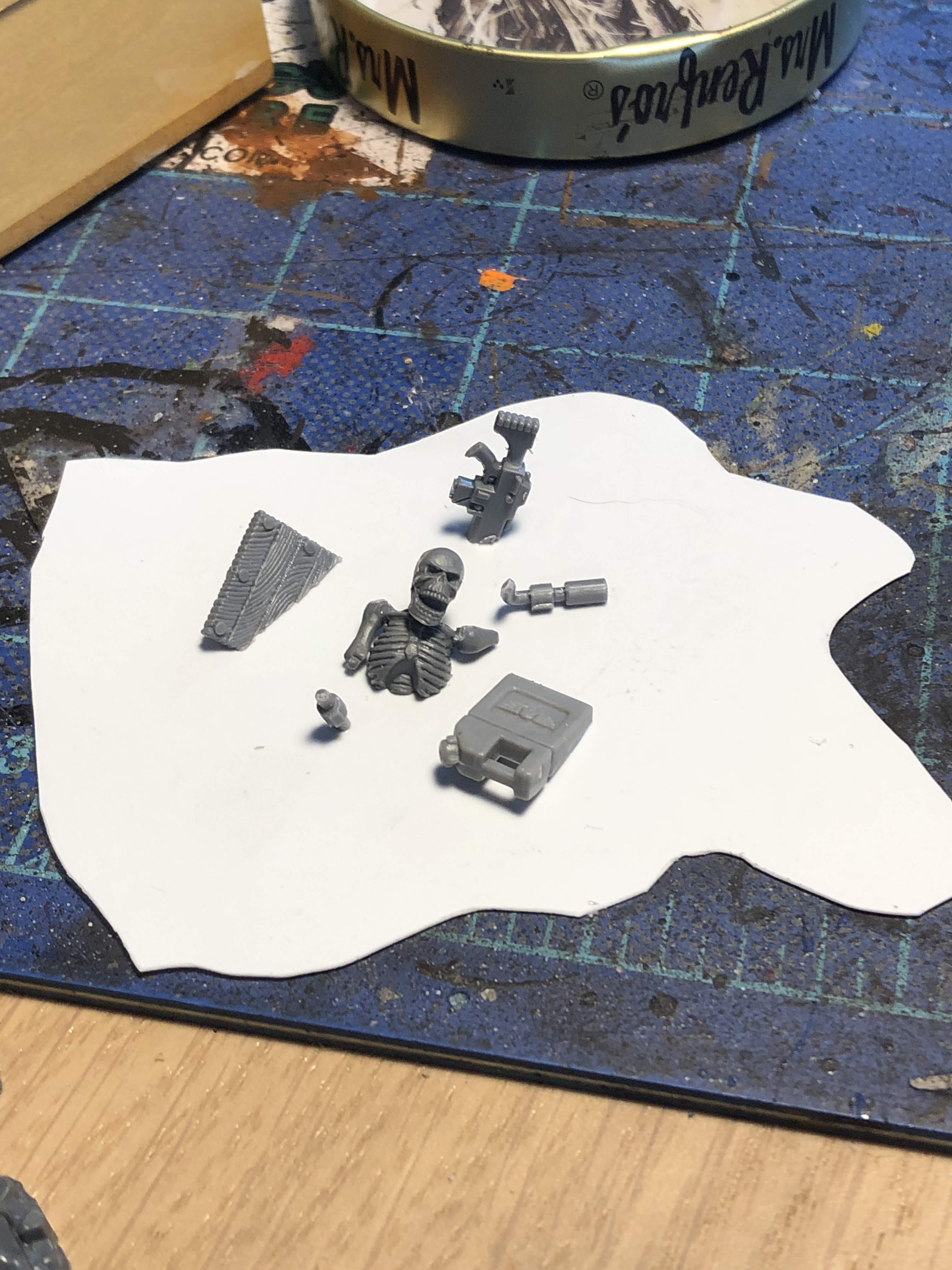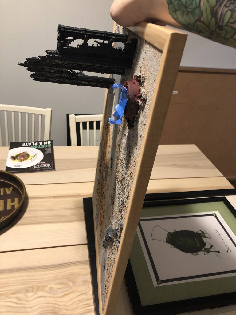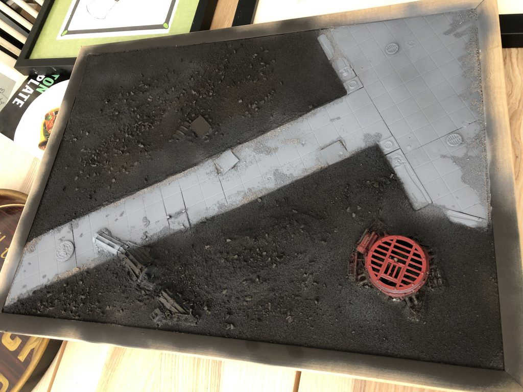 I stupidly didn’t take a picture of it painted, but under the sewer I wanted some grody details. I cut out some plasticard to shape and cut up some bits to look submerged. I later painted it with a bunch of greens and contrast paints and it looks suitably murky and gross. I would paint it, stick it under the sewer grate, and leave it masked off for the rest of the painting process, but you can see the construction here: