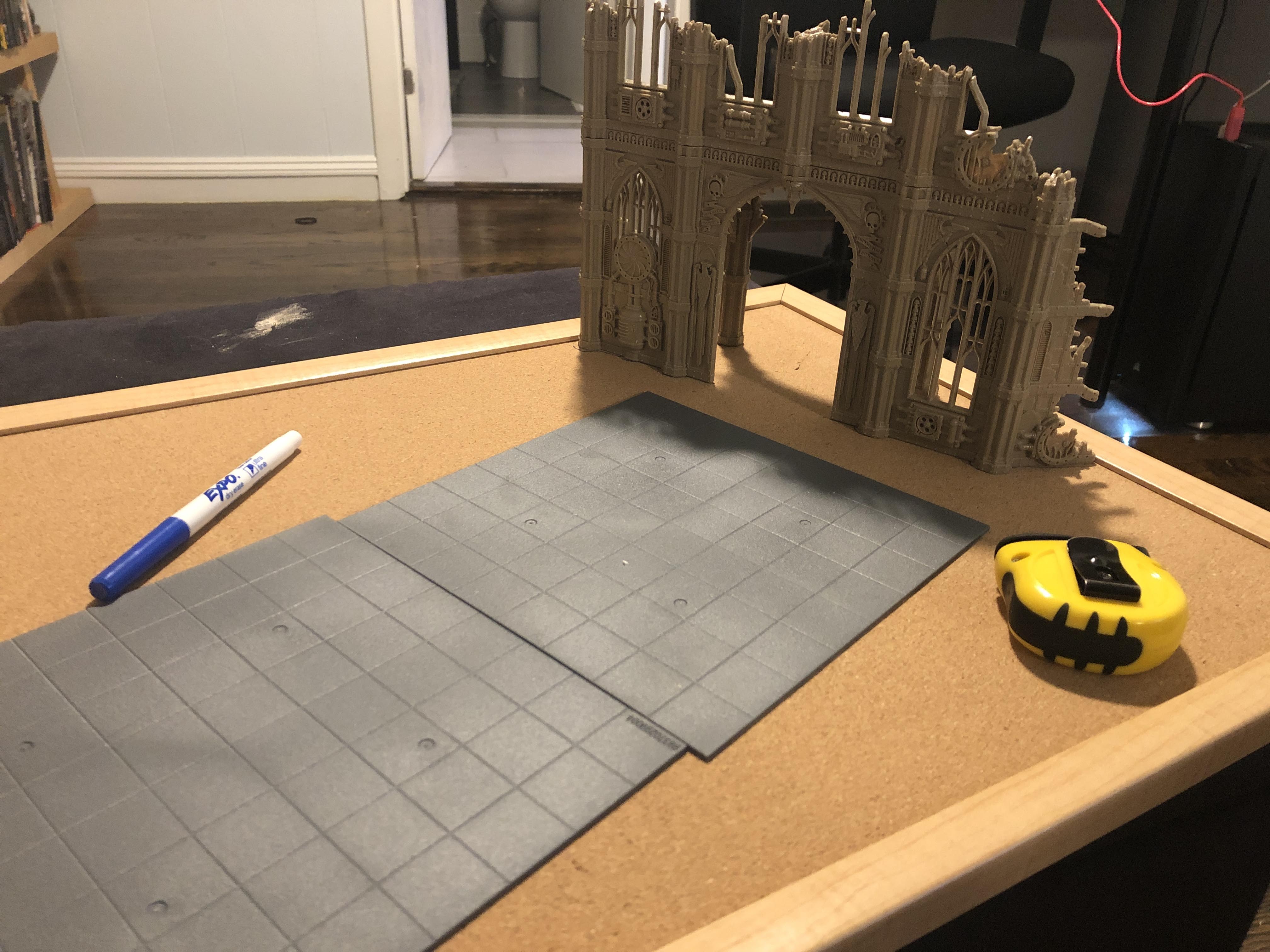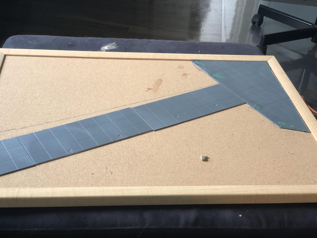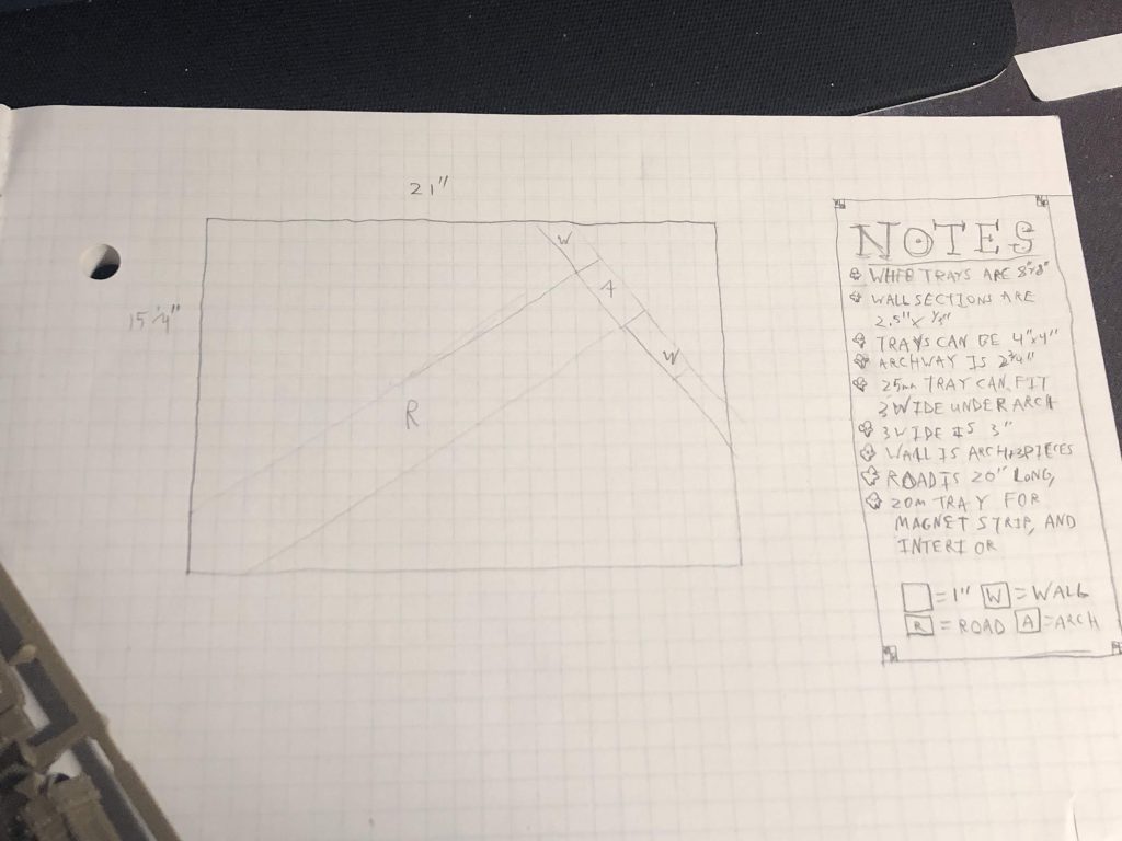 Badcast about how I built and painted my existing display board whilst extremely drunk in a hotel in Maine the night before a tournament in 2014. It had served me well but it had seen better days, and so I decided it was time to build a new board for NOVA. But first I needed to gather materials and plan. I got some tacky glue, basing sand, a corkboard, measuring tape, and some graph paper, and started mapping things out: