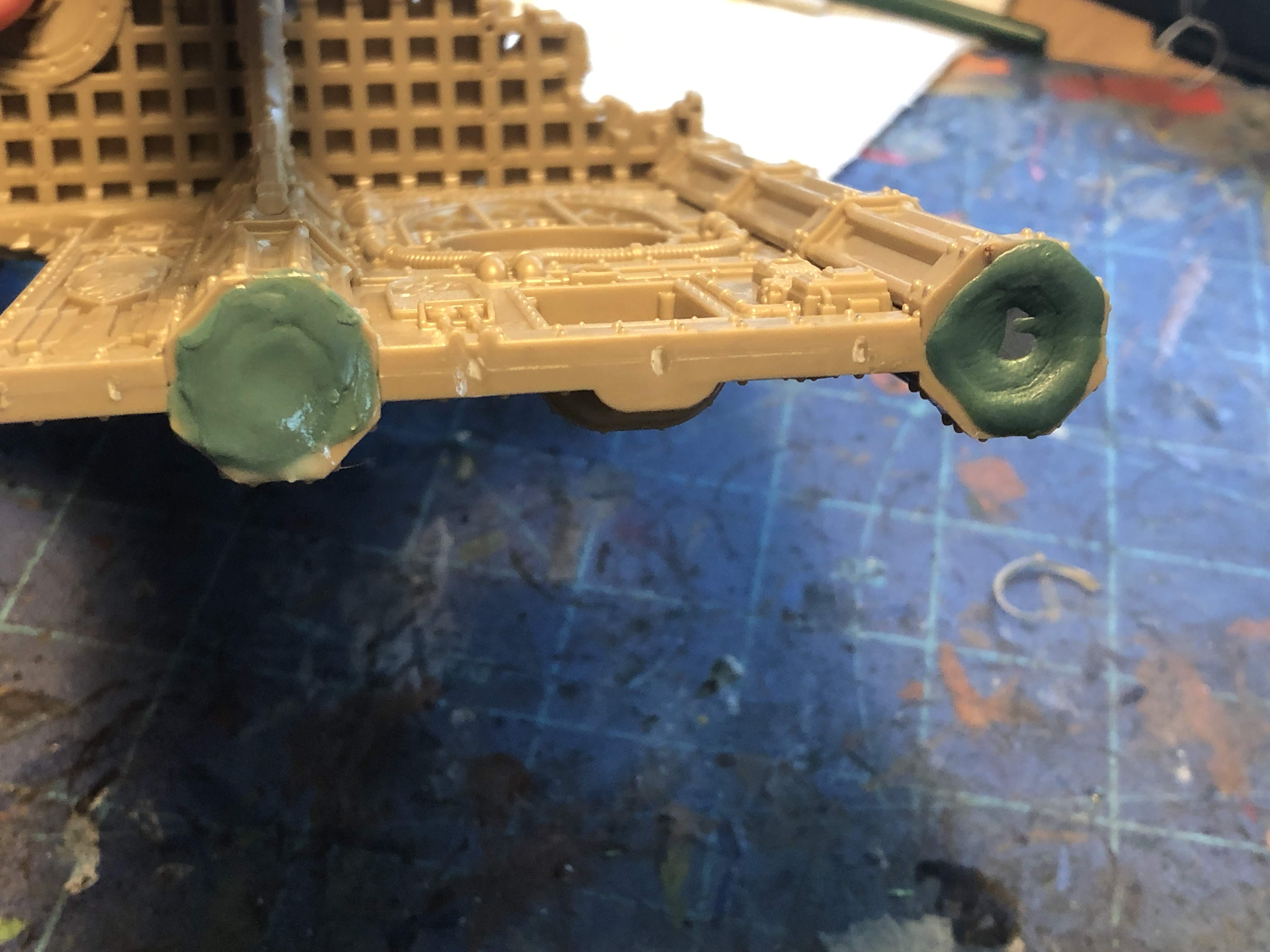 At this point, I was ready to paint. I got 3-4 cheap cans of spray primer from Home Depot and did the base and rough highlights of brown and green. The spray did eat into my foam a little bit which I wasn't expecting. However, most of the foam was covered with sculpt-to-mould or plasticard so the damage was minimal.