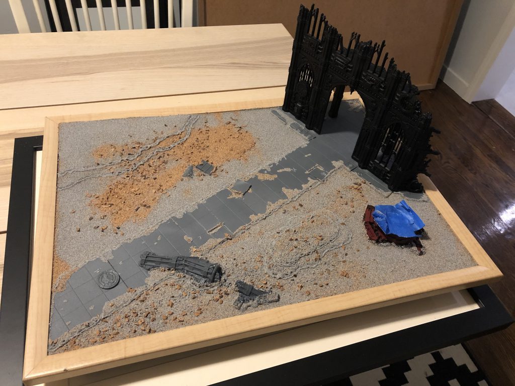 The board was starting to come together, and it was time to add a little more interest to it. I did some weathering to the roadway, but also cut out some pavers to give it more of that war-torn feel. I also ended up cutting my hands a few times doing this, as the plastic is particularly stubborn, but live and learn, right? I dropped in a few sunken barrels and boxes from the Sector Imperialis basing kit, and also built a sort of sidewalk around the building’s foundation. There were also some nice vents and a manhole cover here, which I added to the board. The last touch on the road was to add a fallen column coming from just off-screen as it were, using the Urban Conquest bits. Now it was time to add some sand!