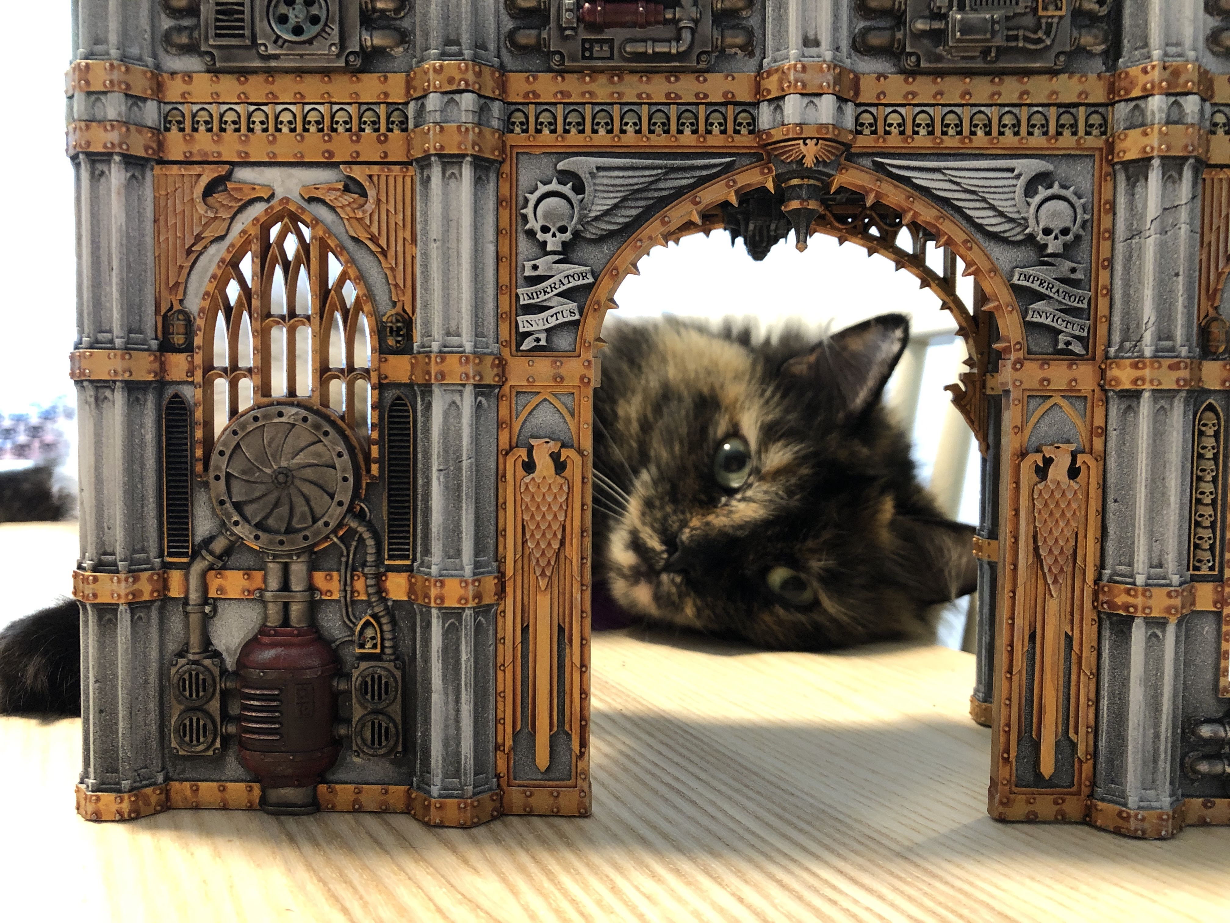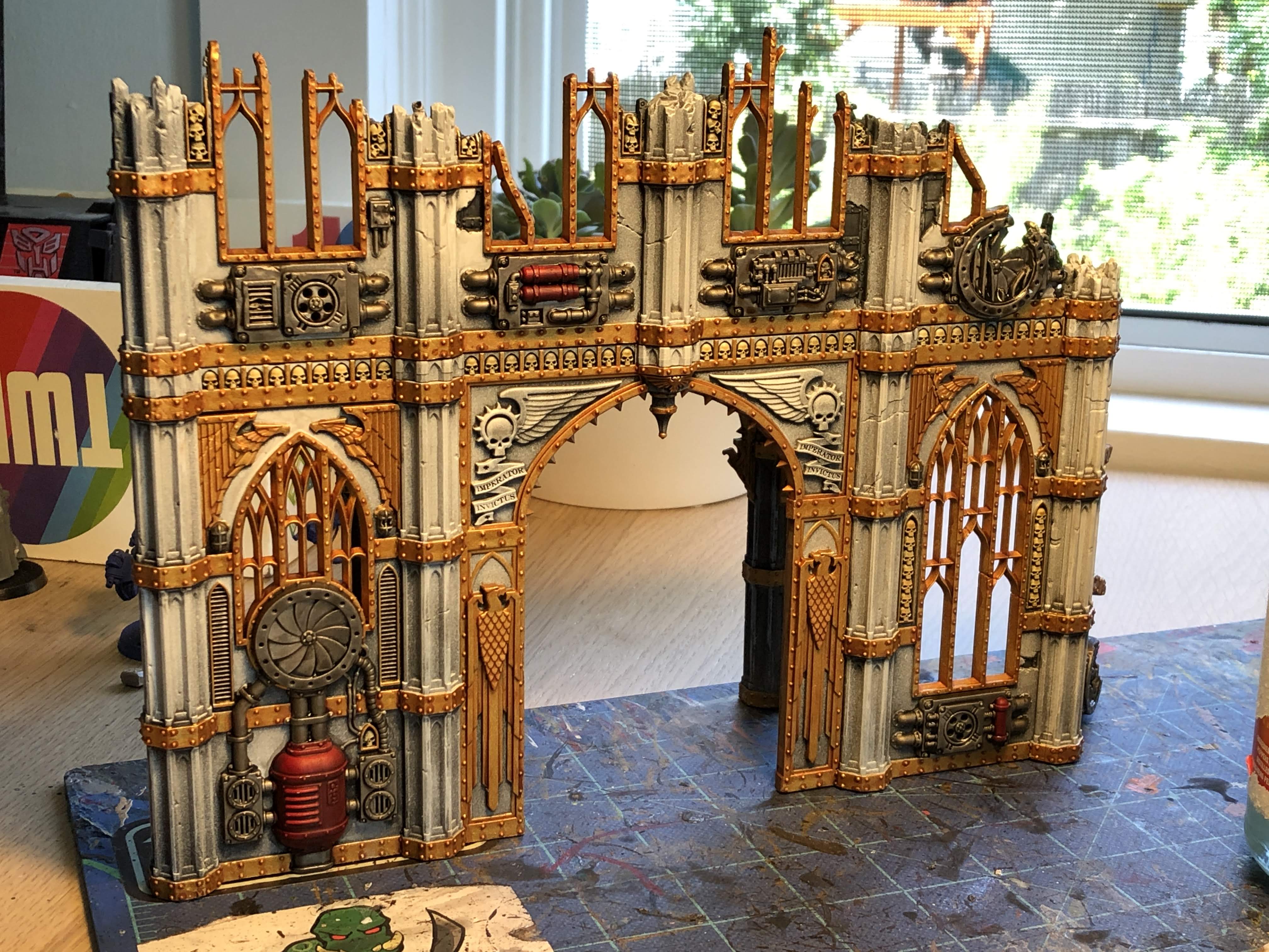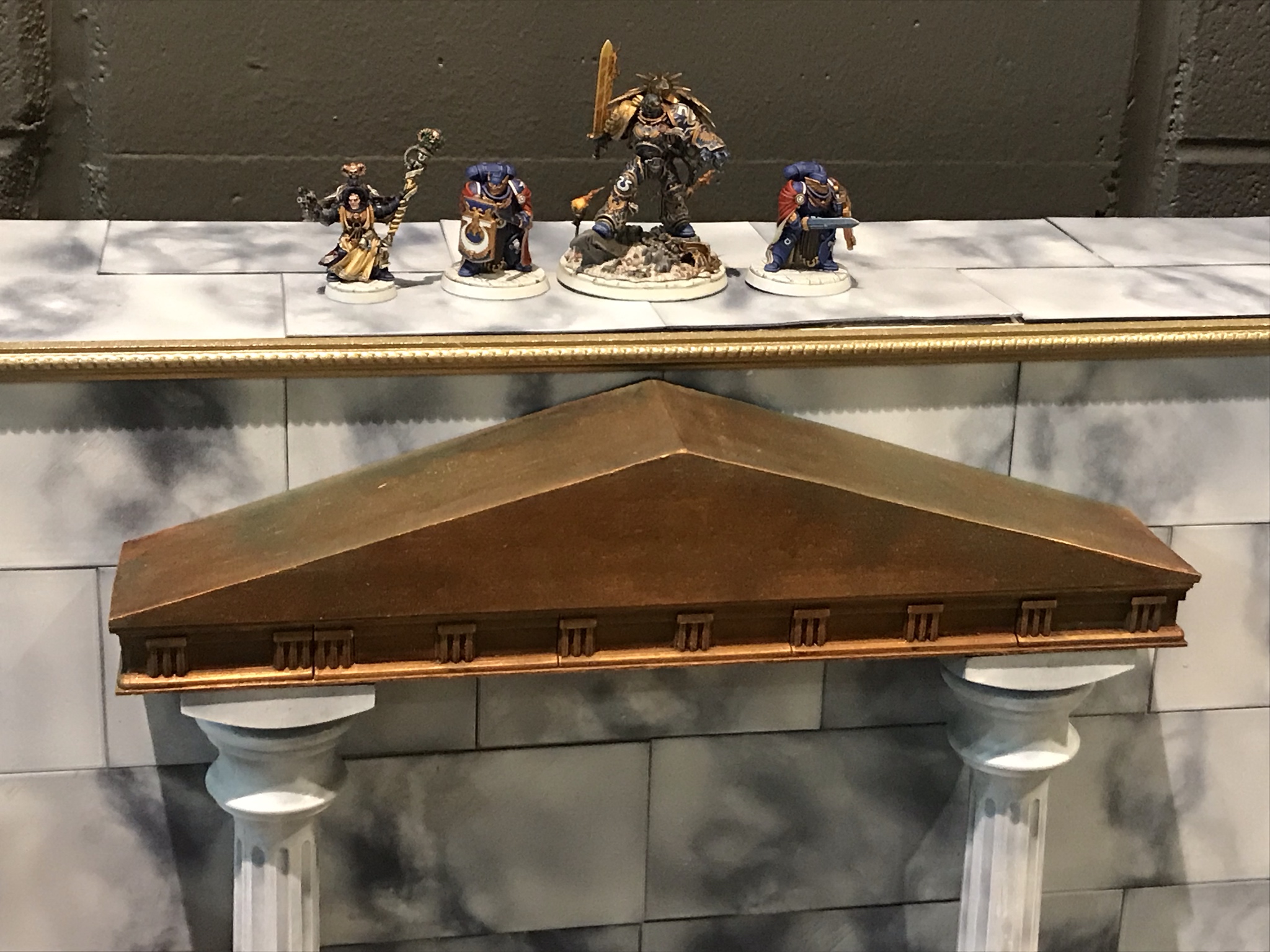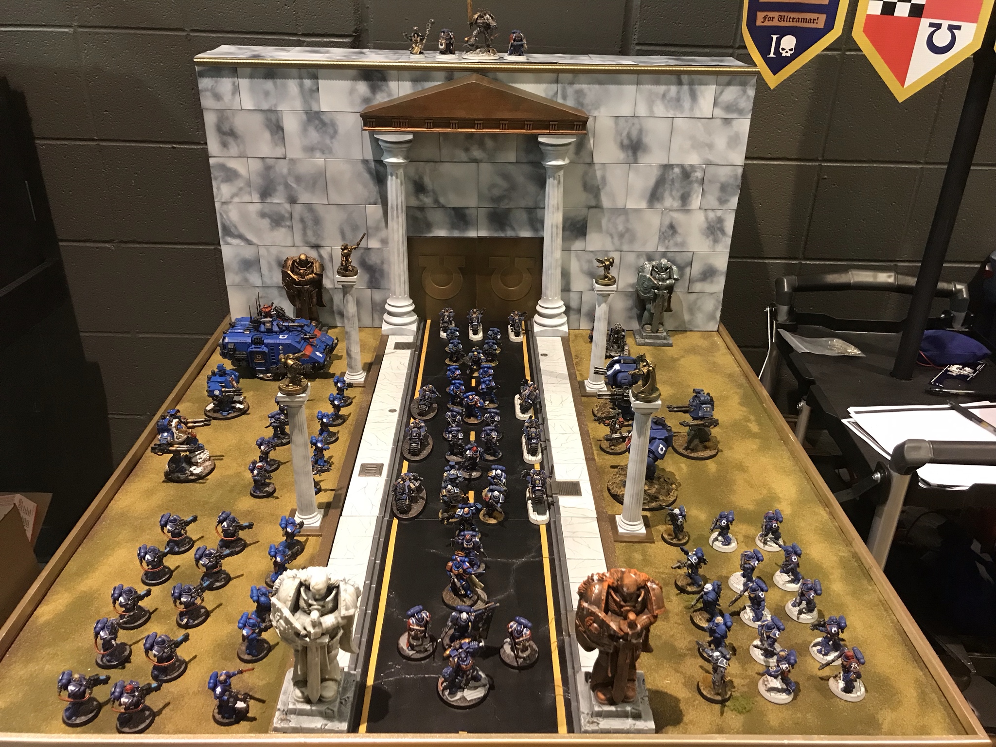 This is our 2019 Team Tournament Display for Adepticon. This was primarily constructed by our teammate Brian who used a combination of 3D Printing, Traditional Foamwork, and Airbrushing to create an excellent display board. The roadway is from Secret Weapon Miniatures' City line, and was painted by me, while the statues were painted by Goonhammer's Robert Jones with some clever chaos artwork hidden on the backside of one, and copious amounts of bird droppings. Brian printed the archway and gate, while using a layered airbrushing method using Halloween web decorations to create an excellent marble effect. The columns were also 3D Printed, and then simply topped with Space Marine models base counted in various metallic to give them the illusion of being statues.
