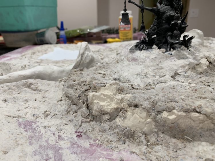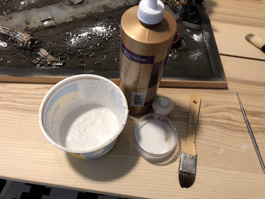 The last step was snow. My normal snow technique looks frankly kind of gross on large swathes of board. My fiancee thought I was growing mold cultures on my old display board, so I thought I’d try something different. This time I mixed PVA glue, snow, and Ceramite White paint into a paste which I gingerly brushed over some parts of the board.