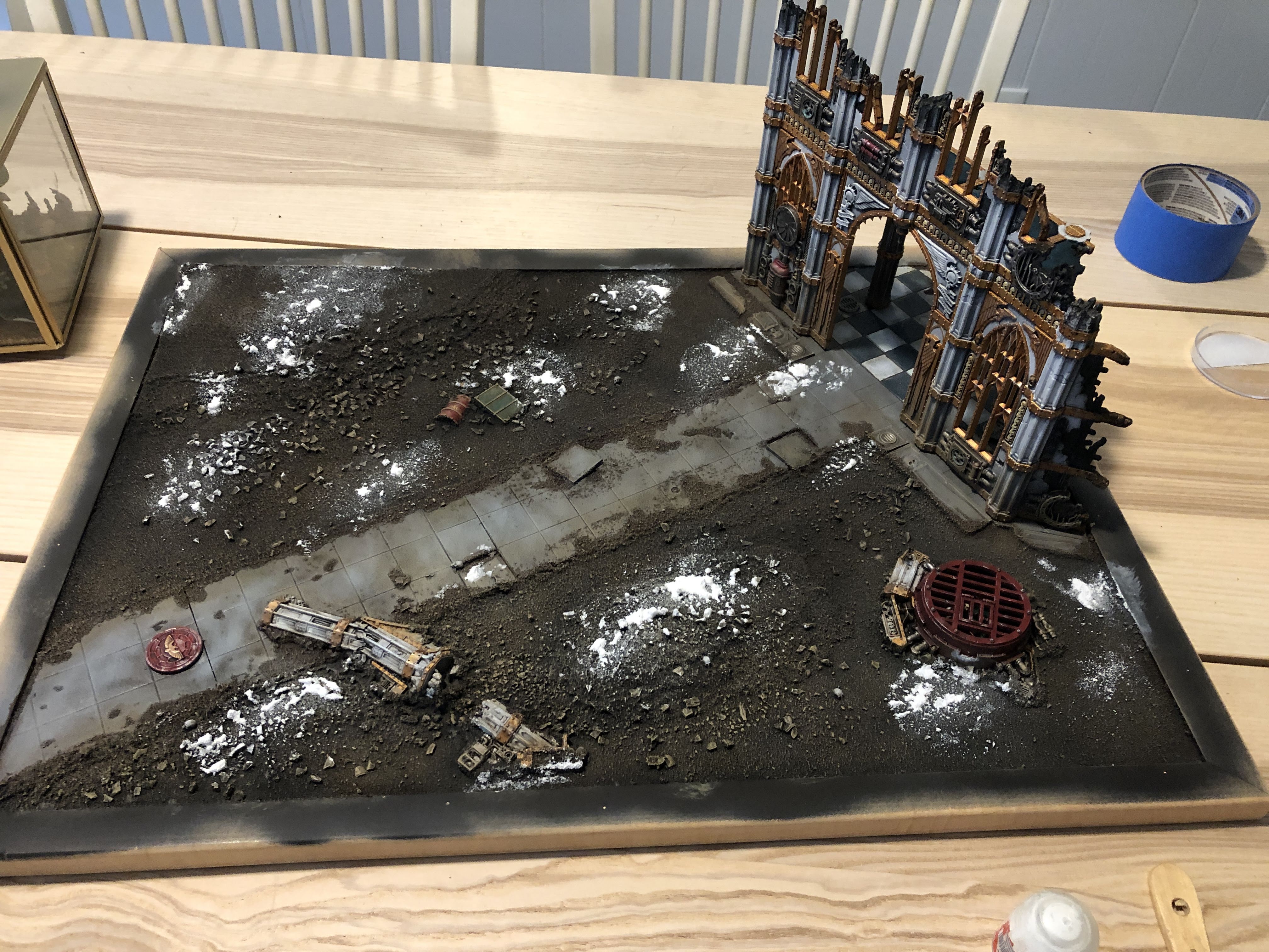 The roads got a healthy coat of Agrax Earthshade followed by a Celestra Grey drybrush, and I picked out the fallen columns in the same color palette as the building. The tiles were Ulthuan Grey and Incubi Darkness, washed black and drybrushed white. I filled in the lines later with watered down Rhinox Hide to clean up my messy brushwork and add definition. I also washed the recesses on the sewer grate with Agrax, and hit it up with a drybrush of Necron Compound. The board followed my basing scheme and got successive drybrushes of Steel Legion Drab, Tallarn Sand, and Karak Stone. I also did some more weathering on the building, adding dust to the bottom with the same colors of the board and black on all the blasted bits.