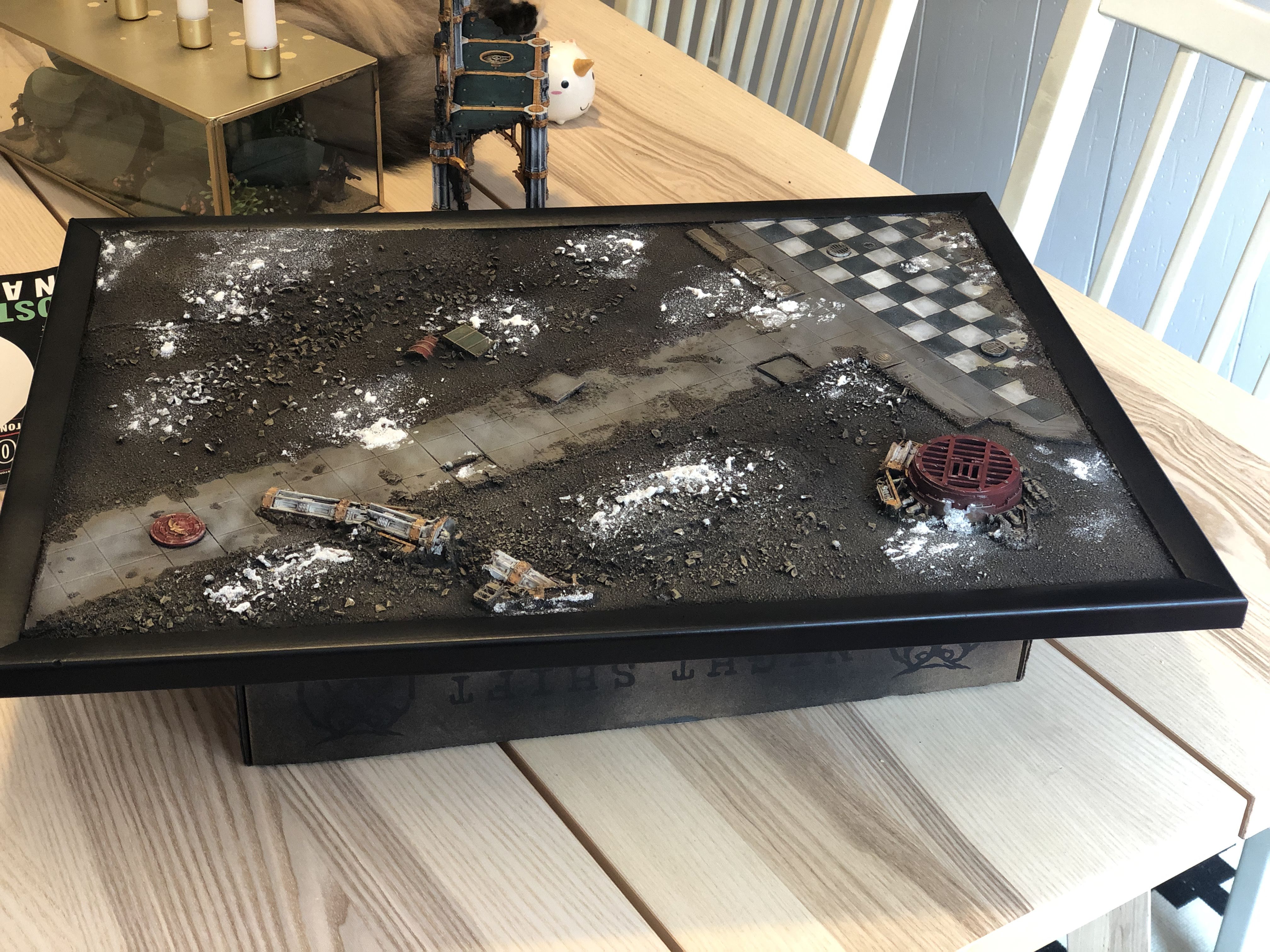 The plan would be to have a long road leading up to a building, at which point the floor would be tiled. The building would be magnetized for ease of transport, and it along with some hills would add some visual interest. I’d also add some scattered debris, skulls, and so on to make the field look more realistic, and I’d paint it to match the winter theme of my models’ bases. As for the roads and floor, I would remain extremely on brand and use out of production WHFB movement trays for them, because of course I would.