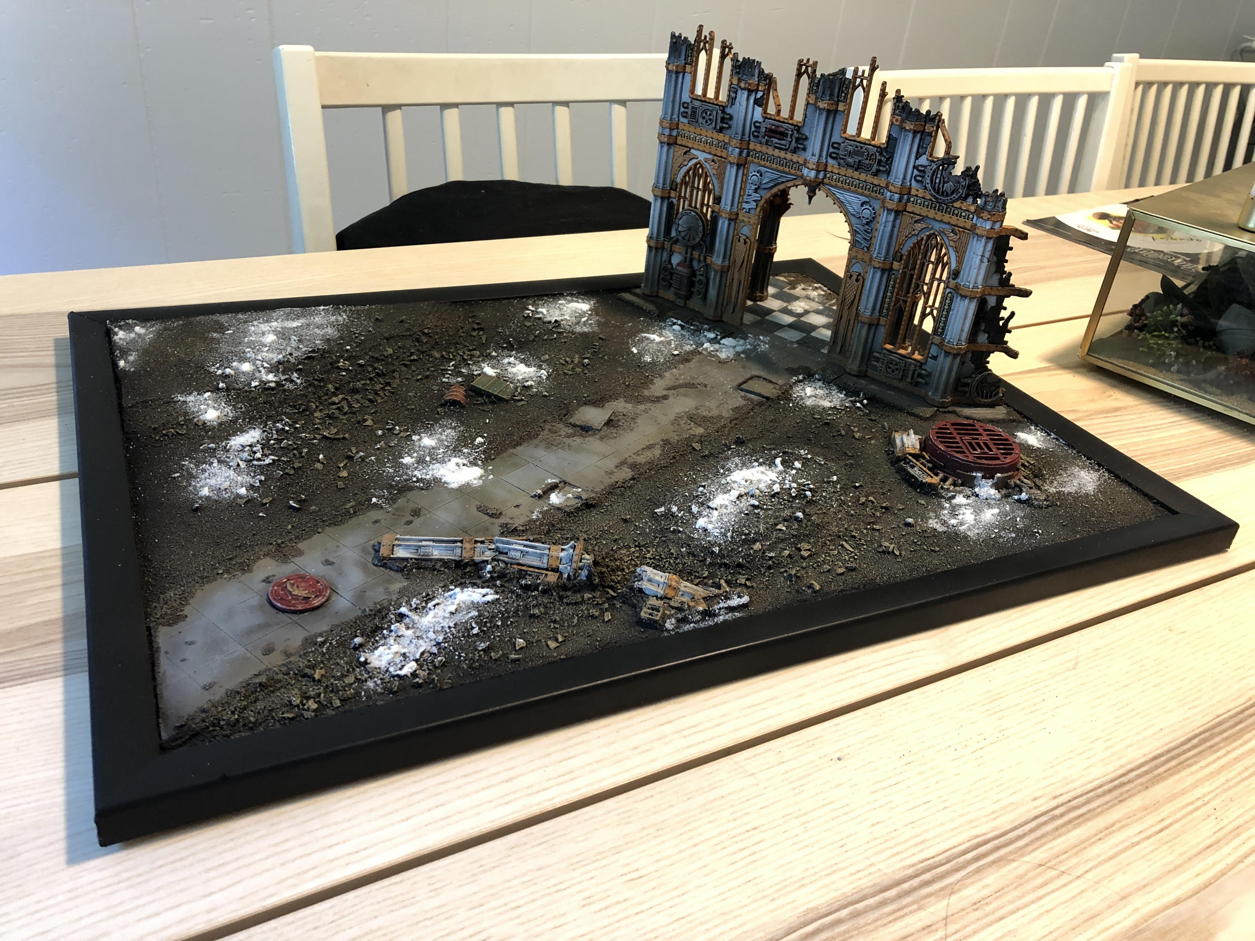 If all you need is something that will hold a large number of minis and isn't going to take a super-long time or investment, then by all means, use a Realm of Battle tile. At a full 2'x2' they're a little unwieldy, but they're made of plastic, match the Games Workshop aesthetic well, and come in a variety of themes and layouts. They can also be quickly made as flat or as tall as you want to make them. I'll admit, I personally am super-lazy when it comes to my display board. This is primarily because I live in an apartment in the New York City area, and so my storage space for things that can't be stacked is pretty limited. The Sector Imperialis boards are ideal for this because all six of them take up very little space and fit into an easy-to-store case. Also because most of my armies have generic concrete basing. This would work even better if I used the matching bases, but I'm not about to shell out for those. Anyways, you can see that the effect is decent, but it's not gonna win me any awards. I'll likely look at adding magnets to the next tile I paint so I can mimic Campbell's approach (see below), and have a tile with terrain attached.