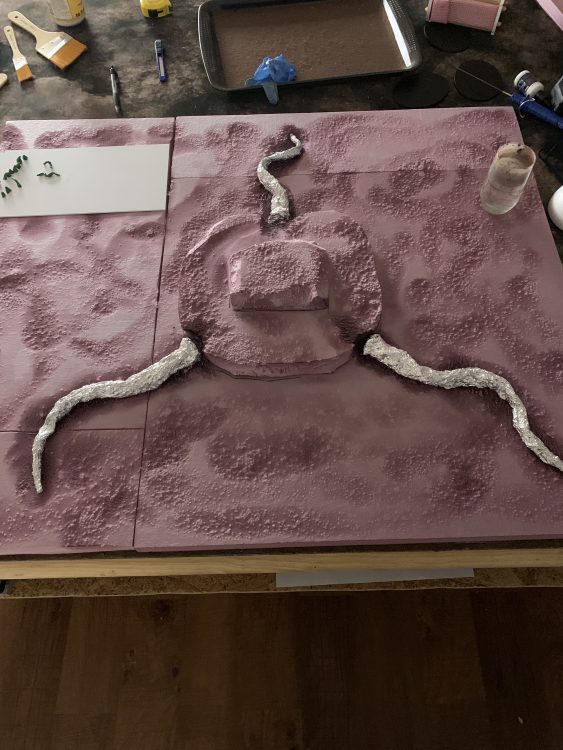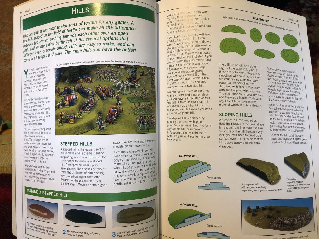 With the footprint of the main attractions settled, I figured it would be time to work in some hills and give the board a more organic feel. I again stayed extremely on brand here and cracked open my old How to Make Wargames Terrain book that GW published in 1996.