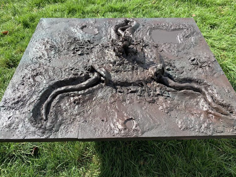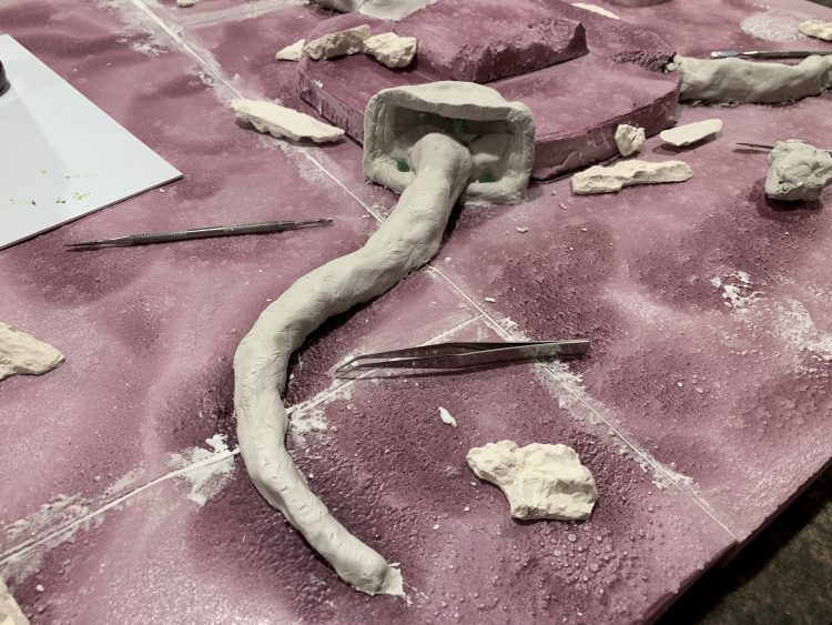 I made a base of plasticard and surrounded it with air-drying clay in order to form where I wanted the pools of blood and goo to be. This, too, was blended in with the sculpt-to-mould.