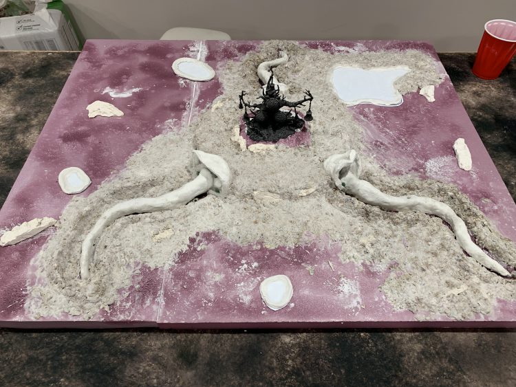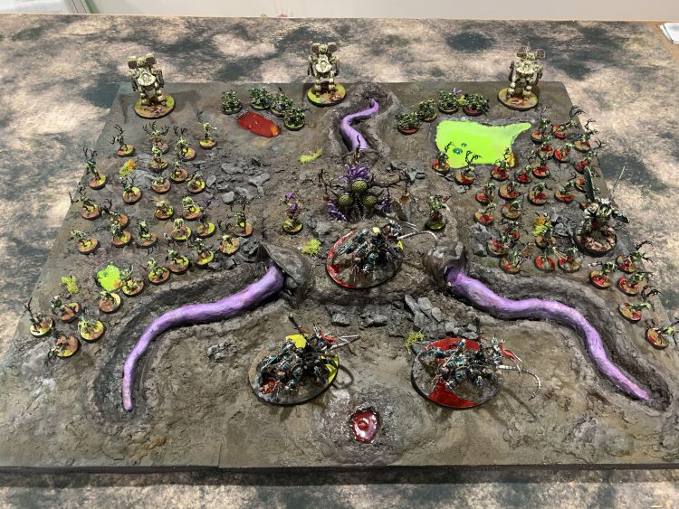 Nurgle. If someone walks up to the board, they should know immediately what I'm going for. I decided to use a spare Feculent Gnarlmaw as the centerpiece of the board, the part that would hopefully catch your attention, and I also wanted to play with the tri-lobe/triangles you see in a lot of Nurgle art. I started by laying out my army to get a sense of how big I wanted it to be and then made it about 6" in each direction larger, so the board wouldn't be cramped. It turned out that it was a mistake to make it this big. Always measure your doors and space in your car, folks.