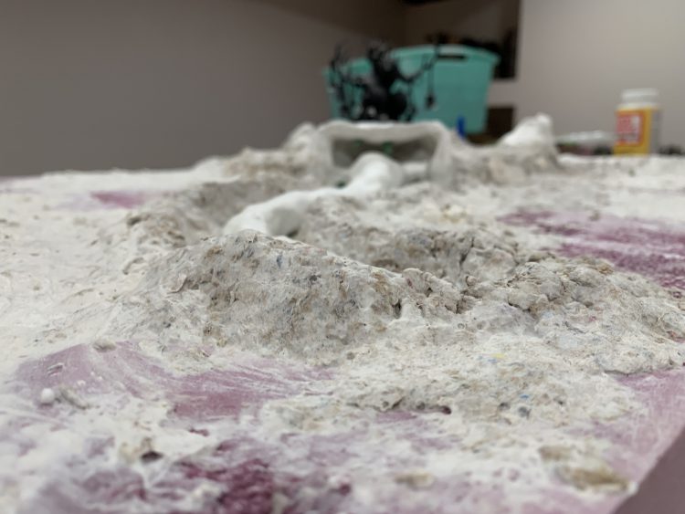 You'll notice that I added some plaster rock molds, another first for me. I ended up using quite a few of those, but they became indiscernible after the next step, which included blending a lot of the components together. To do that, I mixed 50/50 cellulose insulation (essentially recycled paper) and plaster of Paris as a homemade "sculpt-to-mould." Once you get the mixture down, it's pretty easy to work with and I enjoyed building up the ground texture.