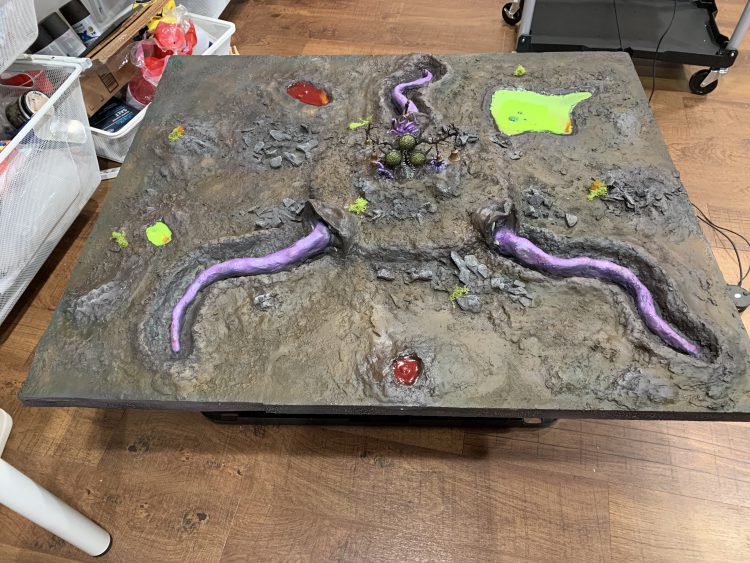 With the building done, it’s time to return to the board. Using masking tape and a few colored sprays, I got the main colors blocked out:
