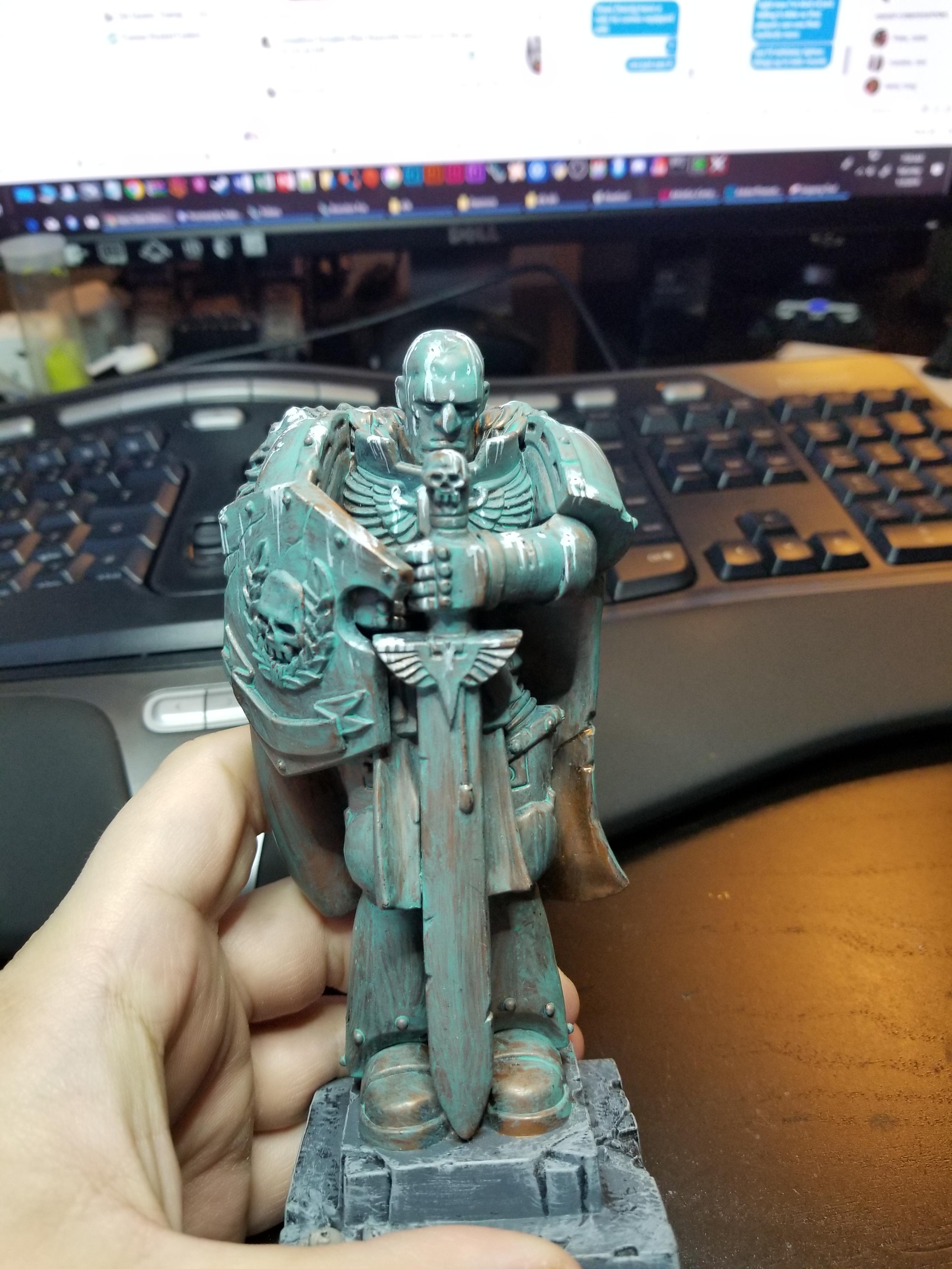 TheChirurgeon's Note: I helped with this one! The guys were running out of time working on the display board and asked for help painting the statues. Being the fast, diligent painter that I am, I was happy to oblige. I painted the marble, copper, and bronze statues, respectively. Being the good Chaos worshipper that I am, there was no way that I was going to just paint up some Imperial statues like some kind of jerk. So I decided to add a little flair, in the form of some graffiti on the back of one statue. Then BuffaloChicken suggested that he had been adding tiny birds and bird poops to the terrain he made for his brother and I realized that my task was clear. I'll cover painting graffiti in a future Narrative Forge but for now, let's go with the easy win.