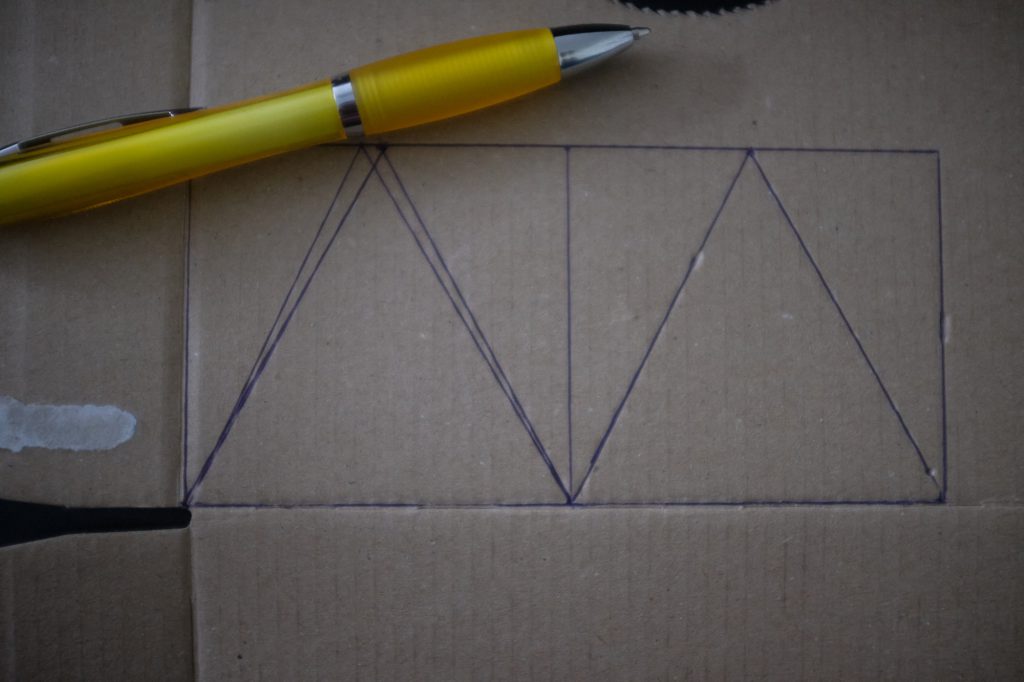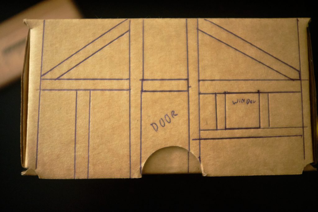 Having found a box that's the right sort of scale, the first thing to do is grab a pen and ruler and start drawing where the beams are going to go. This step helps visualise exactly what the house is going to look like before I even put glue to cardboard; draw your inspiration from photos of existing houses and fantasy artwork.