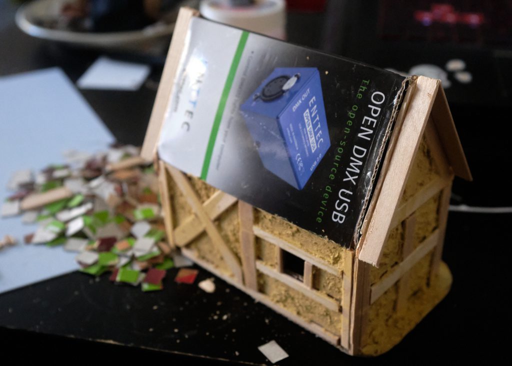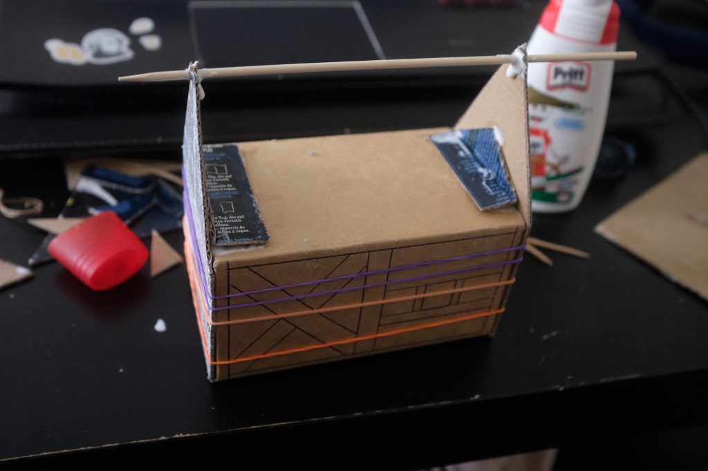 With the general structure finished, we can move onto the decoration! First stop: Beam town. Using the craft sticks, a sharp knife, and some clippers, cut the shapes of the beams.