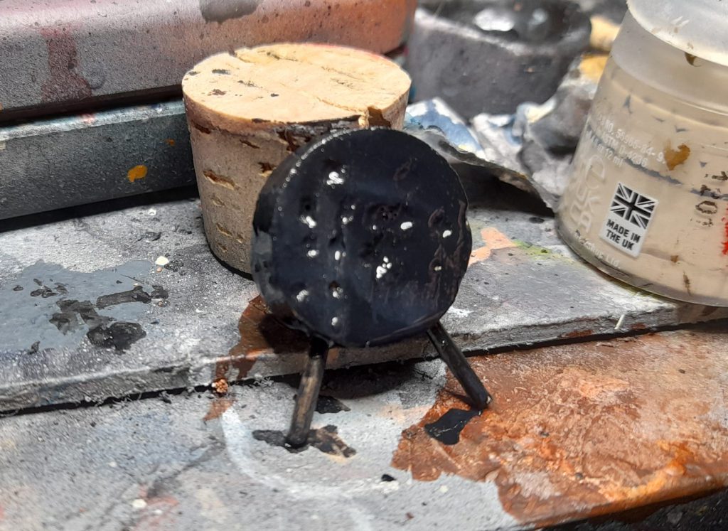 A final little detour before painting, make a practise archery target to lean up against the wall from a slice of cork and two pieces of toothpick. To complete the piece, take some of the arrows from the Mancrusher Gargant kit and stick them in the holes.