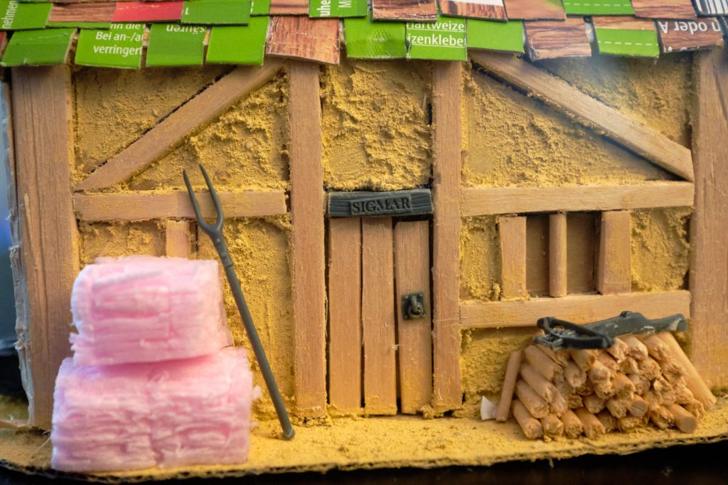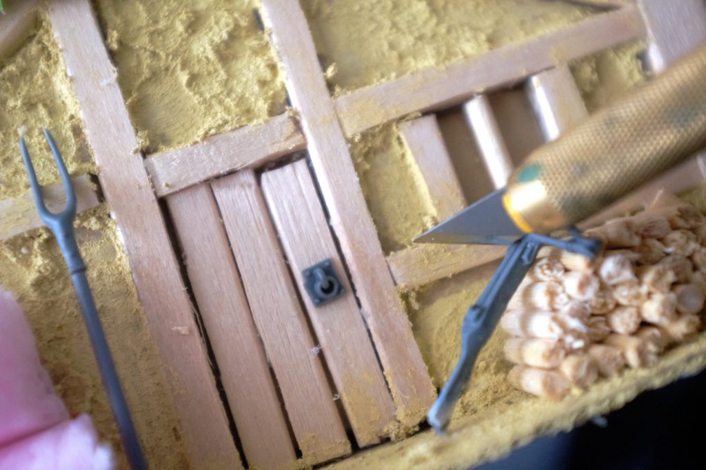 In addition to this stuff, make a woodpile by clipping barbeque skewers into logs and stacking them against the wall. Pretty straightforward. A tiny little axe from a toothpick stump and a little bit of plasticard for the blade completes the set, aww. Making hay-bales from XPS foam is pretty easy. Simply get 3 blocks and slash the shit out of them with a very sharp blade and poke them full of holes on each end. To simulate the bales being tied with some string, draw some lines perpendicular to the cuts you made, about 1mm in from each side.