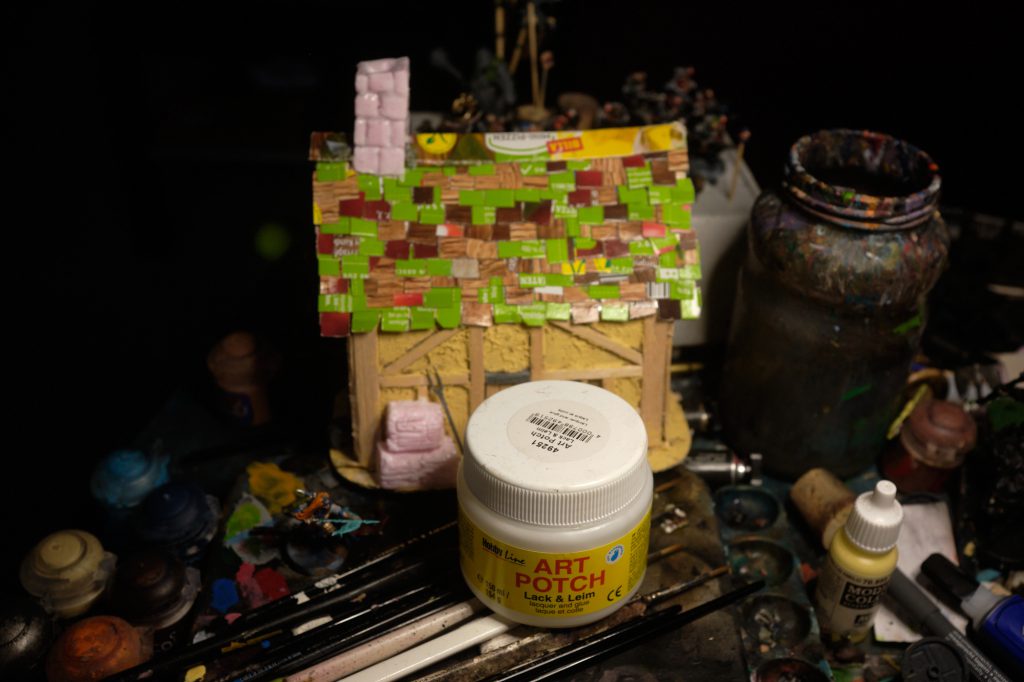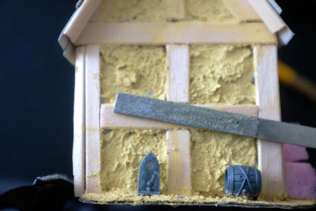 The "Sigmar" beam comes from the Ogre Ironblaster kit. I think it makes a nice addition to the house of this devout family. Once the paint goes on, it won't stand out so much.