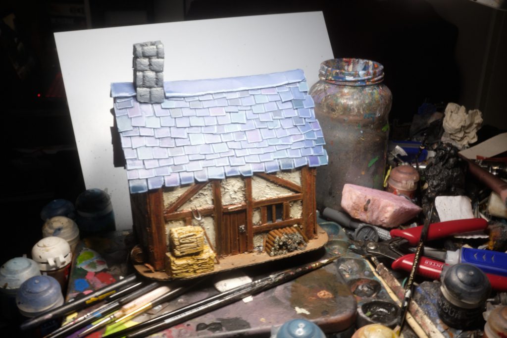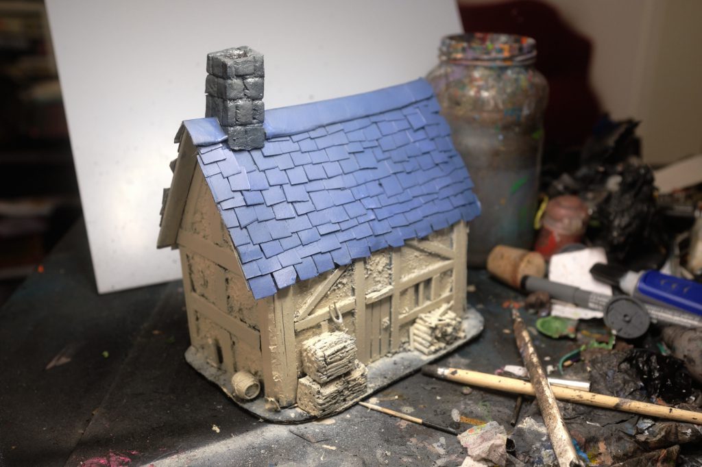 Prime the whole construction with Vallejo Black Surface Primer, and then go over all that with some Wraithbone through the airbrush. This takes absolutely forever, but I don't have Wraithbone in a can, and the propellant from spray cans can melt the XPS foam we used for the chimney and haybales. After that, basecoat all of the tiles with The Fang, again through the airbrush. Finally, basecoat the chimney stack with Vallejo Air Dark Sea Grey.