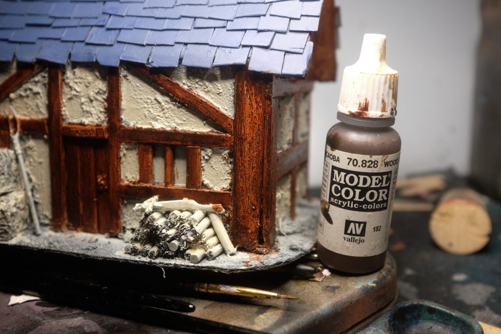Next, go over all the wood with at least two coats of Vallejo Model Color Wood Grain. It's a really nice pseudo-contrast paint that emphasises the grain of the wood a lot. If you chose to scratch the wood up with your blade earlier, this paint will make those marks stand out nicely. Just make sure that you use two coats, otherwise it can be a little blotchy.