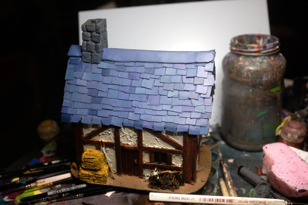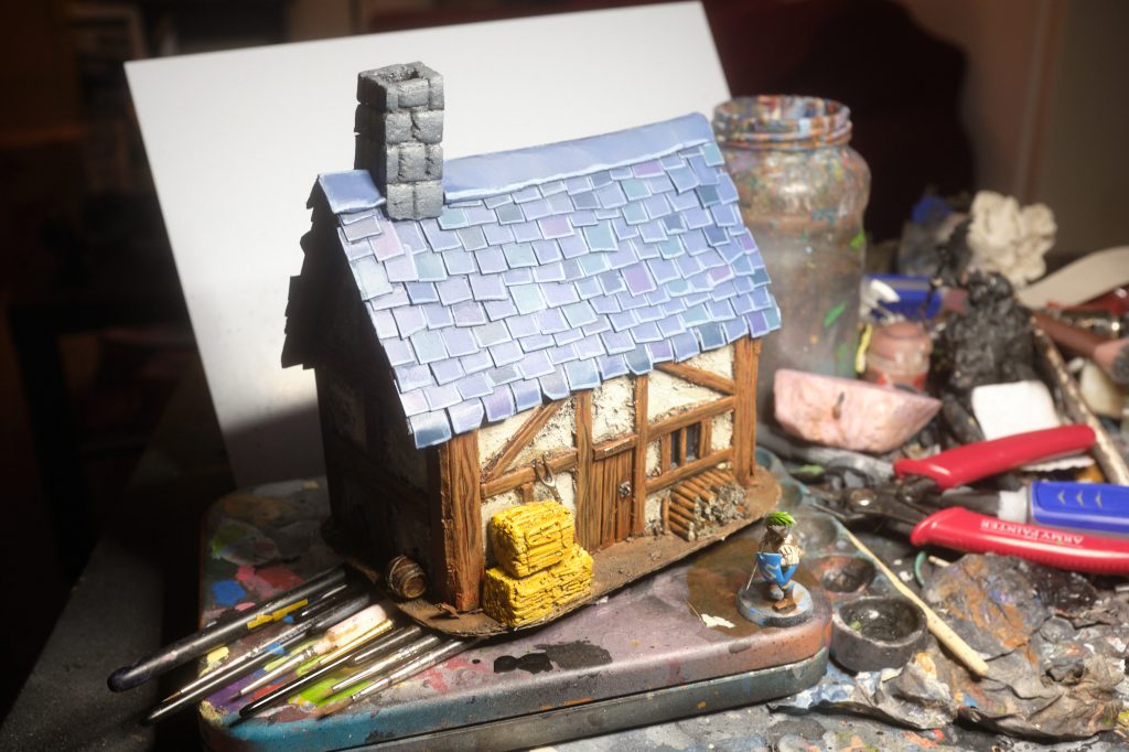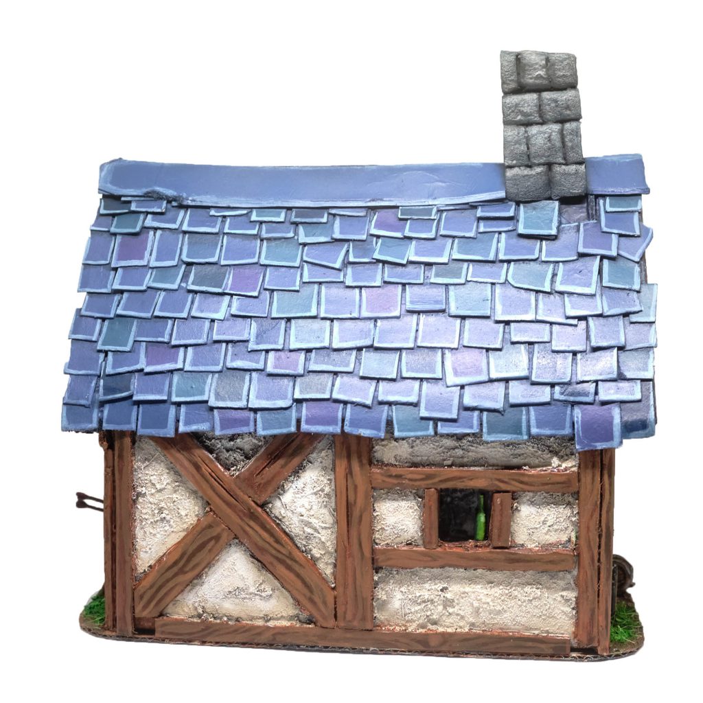 To add some variation to the roof tiles, pick out tiles at random and paint them with various shades of blues and purples. I mixed a little Xereus Purple into The Fang to make a soft purple tint. Other tiles were basecoated with Stegadon Scale Green, Thunderhawk Blue, and Night Lords Blue. Keep it random, but try not to have two of the same colour next to each other (unless that colour is the base tone, in this case, The Fang.)