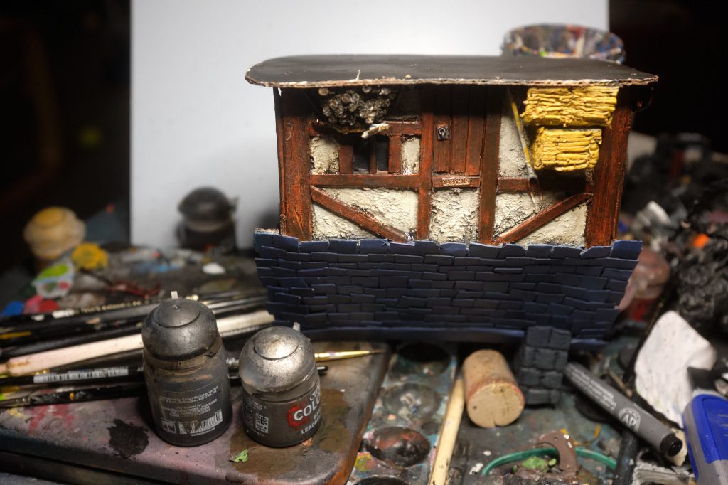 Wash the off-white panels between the wood using very thinned-down Nuln Oil. Try doing this with the house turned upside down so that it runs a bit and settles naturally against the underside of the various beams. Use this moment to basecoat the steel metallics with some Leadbelcher, and the brass of the Sigmar plaque with Runelord Brass.