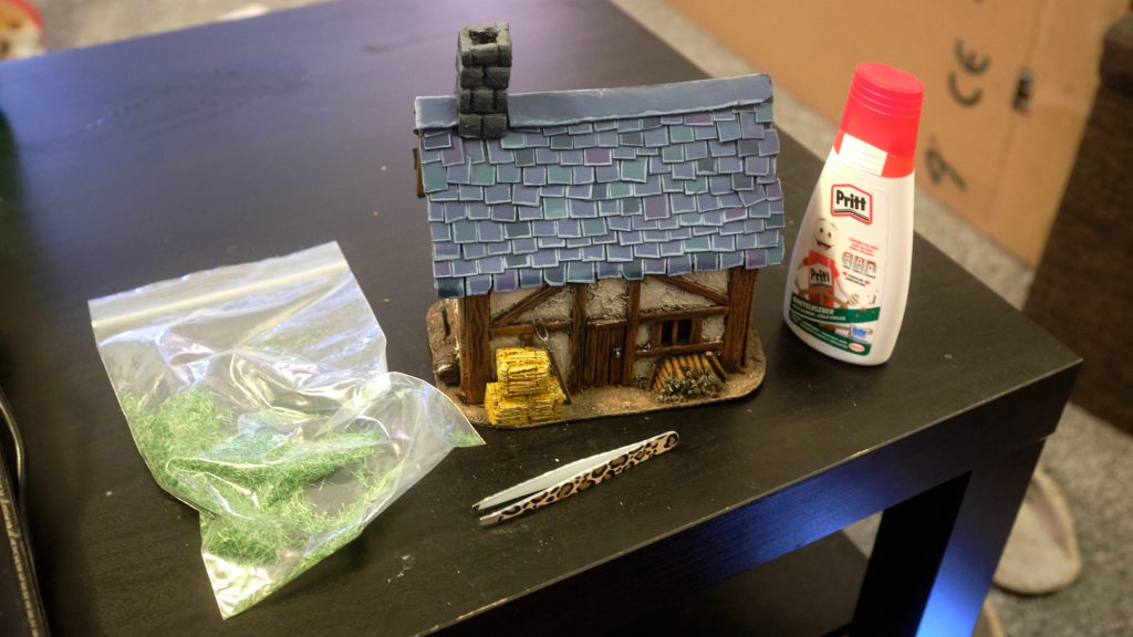 Blob PVA glue in places where you want some grass. Sprinkle said grass onto the PVA glue blobs. Once they're dry, blow off the excess and you have some patches of grass in your yard! I wasn't very happy with the colour of mine, it looked a bit dead, so I put a little Biel-Tan Green and ScaleColor Lime Green Ink onto it to give it a bit more pizzazz.
