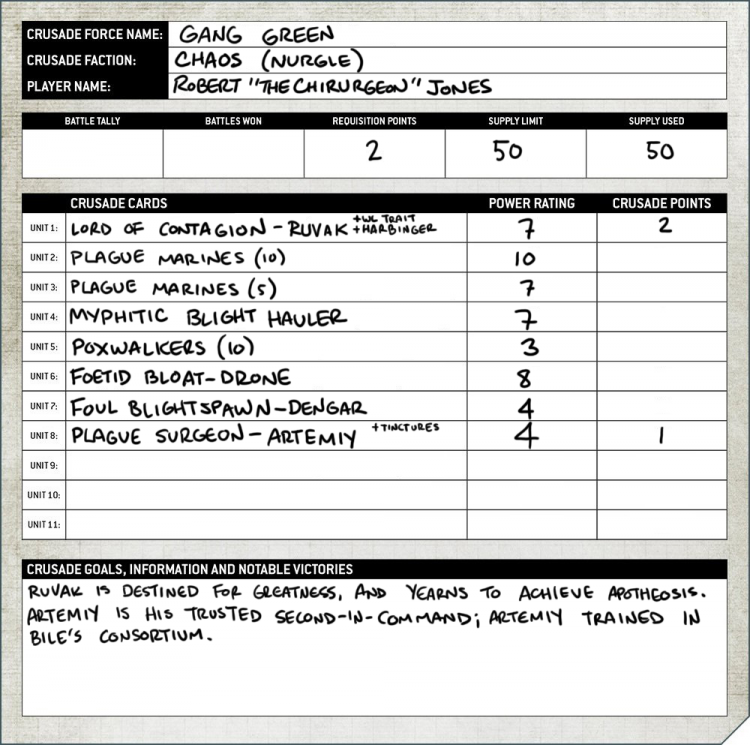 I will almost certainly be using RP to increase my Supply Limit so I can fill out a squad of marines and maybe rearm for close combat. At some point in August I’m also hoping to receive my Kickstarter Daemon Prince so I’ll need to add him in too. And maybe some happy little Myphitic Blight-haulers to toddle about the field. Or I could be competitive for a change and grab a small Nurgle Daemon detachment… but Greg’s crown calls out to me so no I say!