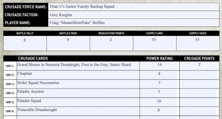 Grey Knights are absolutely constrained when it comes to building a Crusade Roster. I definitely want a Dreadknight Grand Master and a small unit of Paladins in my roster, and right there I've already exhausted nearly half of my Requisition Points! I'll definitely need a cheaper HQ if I want to play Combat Patrol games, so I'm throwing in a Chaplain as well - I was lucky enough to get ahold of a store opening Chaplain, so he's perfect to join my Grey Knights. A single Strike Squad is all but mandatory, and I'm going to wrap up the roster with a shooty Venerable Dreadnought and a Paladin Ancient. I'll need to spend one RP on reinforcements but it's worth the tiny amount of flexibility.