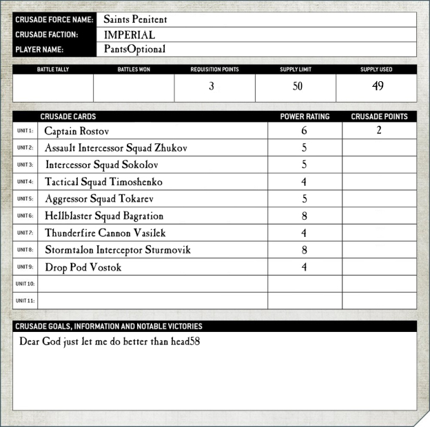 Since the unit was a Patrol, I decided to add two units of Infiltrators for holding objectives and generally messing with the deployment of my opponent. Since we're using Power Level there's no reason not to add bonuses like an Infiltrator Comm Array even though I can't use it. Eventually I plan on making those units larger and adding a Phobos Lieutenant and Captain. Some Outrider Squads will give me a nasty bit of mobility and flexibility, and that left just enough RP to take a full sized squad of Assault Intercessors and give them the Veteran Intercessor ability. That's a potential 51 attacks on the charge, and if the Chaplain is around the right Litanies can make them re-roll both hits and wounds. This leaves me 11 supply left for various options which I'll explore later. Perhaps I'll add those Phobos HQ choices, or wait until I have enough RP to drop another squad of Assault Intercessors with the Veteran upgrade. The possibilities are endless, and having some flexibility is great for when you want to see how the narrative works out.