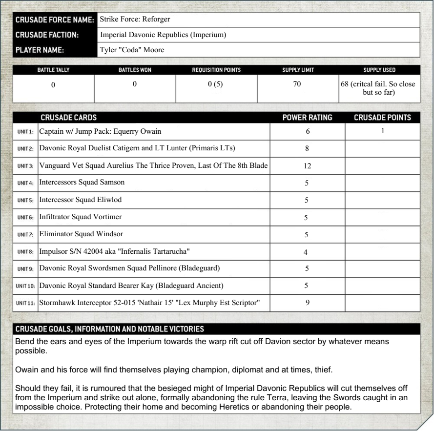new and exciting mission. This army will attempt bend the ears and eyes of the Imperium towards the warp rift cut off Davion sector by whatever means possible. Owain and his force will find themselves playing champion, diplomat and at times, thief. Should they fail, it is rumoured that the besieged might of Imperial Davonic Republics will cut themselves off from the Imperium and strike out alone, formally abandoning the rule Terra. While Crusade doesn't cover kill team or linked games yet,
